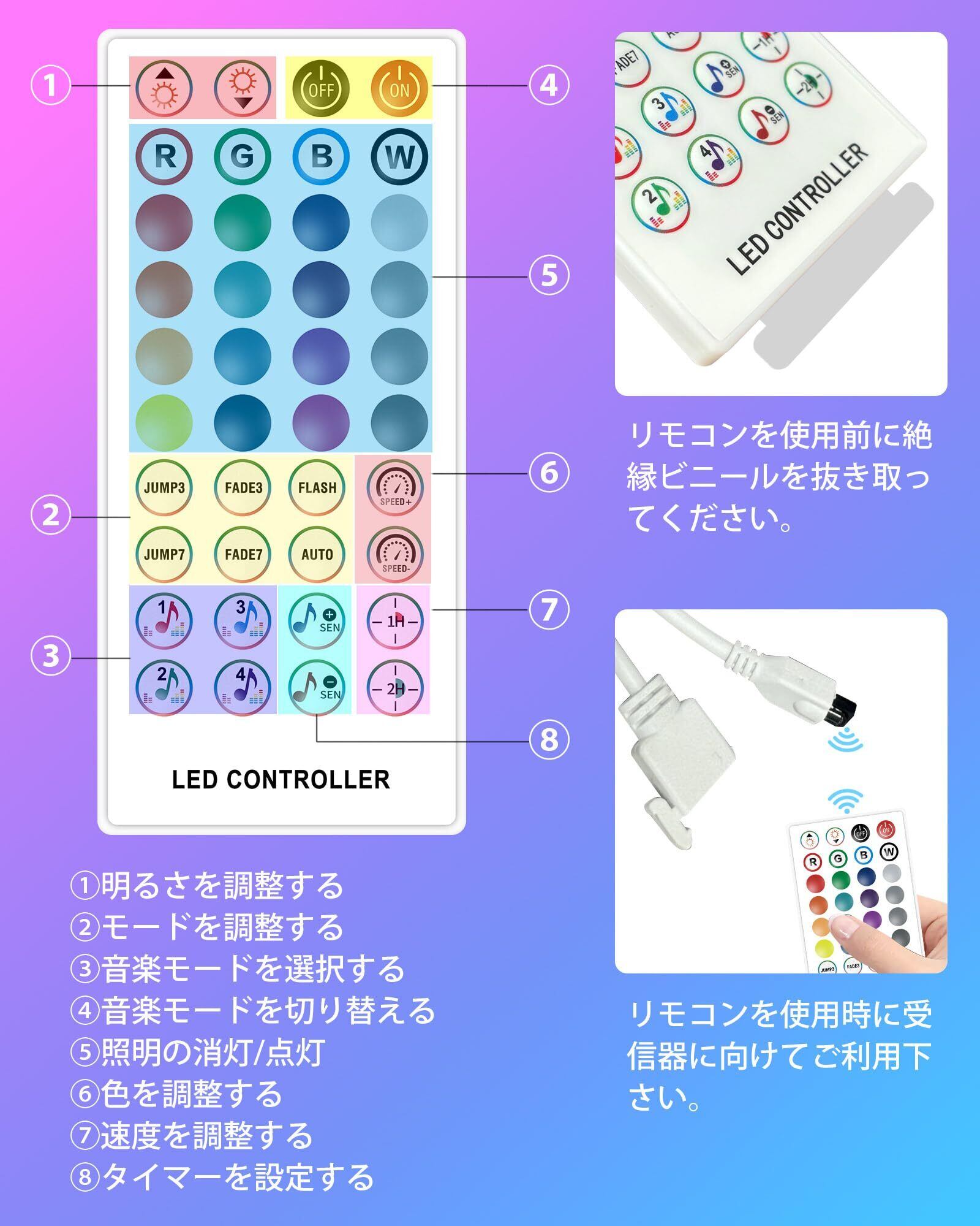 【デュアルコントロール、タイマー機能】アプリと40キーリモコンでテープライトのコントロールが可能。 AndroidとiOSに対応したBluetoothでアプリと接続することで、ledテープライトをコントロールすることができます。 ライトのON/OFF、明るさ、発光色、タイマーは、アプリから簡単に設定できます。 ※本製品は防水仕様ではありません。