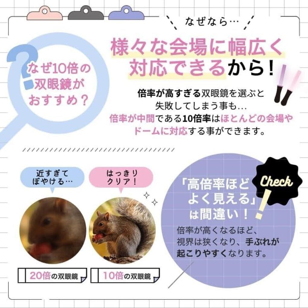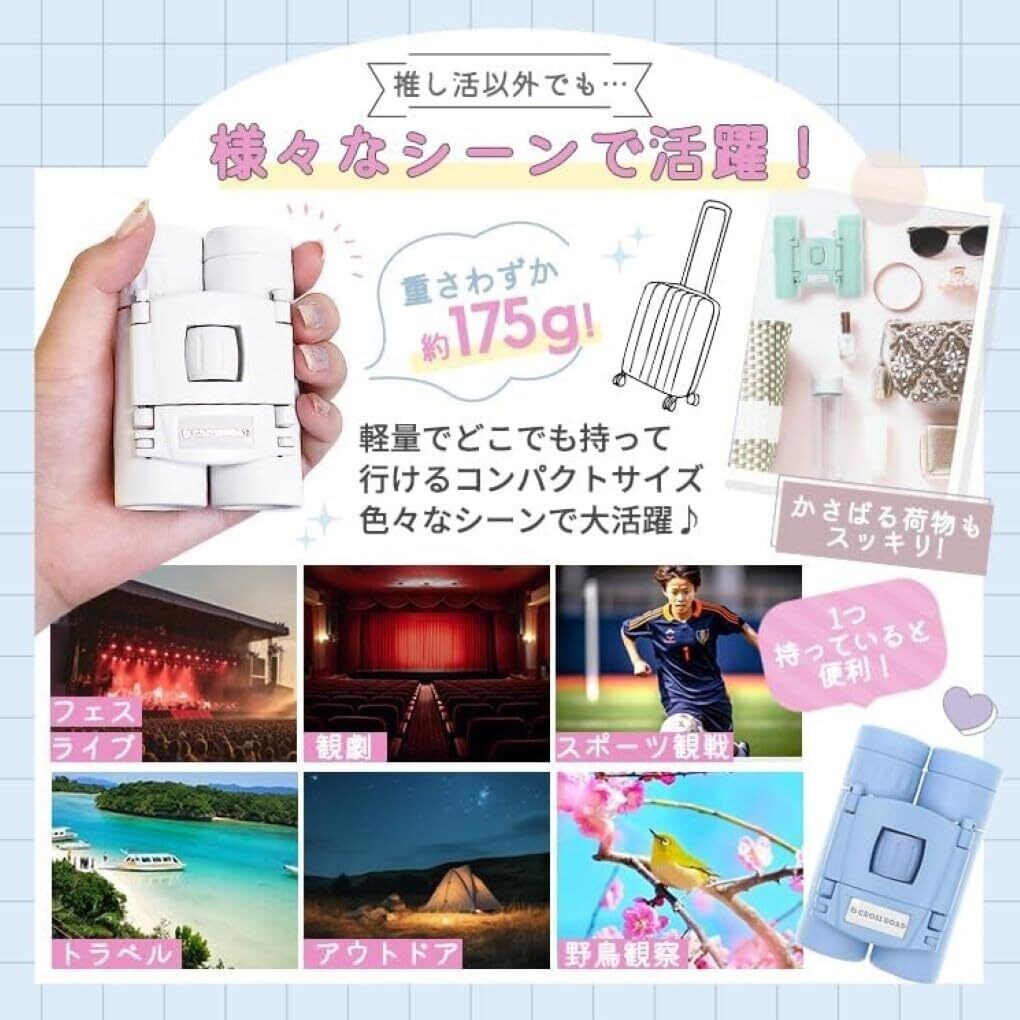 コンサート・観劇専用双眼鏡 コンサートやライブ、観劇におすすめの2023年版最新双眼鏡。 推し活に最適な機能を備えています! 倍率:10倍 当店おすすめの10倍でほとんどの会場、ドームでご満足頂けます。 ●おススメの理由その①● 10倍の双眼鏡 様々な会場に幅広く対応できる倍率=10倍率 双眼鏡には拡大倍率の大小の種類があります。 「大きく近くで見たい」という理由で倍率が高すぎる双眼鏡を選ぶと、せっかくの推しが拡大しすぎて何を見ているか分からない状態なんて事に... 逆に低い倍率だとせっかくの双眼鏡があまり意味が無いという事態になってしまう事も。 そういった失敗にならない様に、倍率が中間である10倍率はほとんどの会場やドームに対応する事ができます。 ◆10倍の見え方 10倍って言われても実際にはどんな見え方か? 例えばコンサートなどで客席からステージまでの距離が100mだった場合、 10倍の双眼鏡を使用することにより約10mの距離まで近づいた時とほぼ同じ大きさで見ることができます。 例えばその②、コンサートなどで客席からステージまでの距離が半分の50mだった場合、 10倍の双眼鏡を使用すると約5mの距離まで近づいた時とほぼ同じ大きさで見ることができます。 ●おススメの理由その②● こんな方におススメ コンサートやライブで推しをハッキリと見たい! こちらの商品は明るくクリアな視界、BAK4プリズムを採用しています。 業界最新の高透過率のBak4レンズを採用し光をより多く取り込み、明るく鮮明な視界に。 コンサートやオペラハウス、劇場などの暗い会場でも演者がクッキリと見え臨場感あふれ立体的な視野を確保。 ●おススメの理由その③● こんな方におススメPart2 大きく至近距離で観劇を楽しみたい! 広い視界を確保。 従来の双眼鏡よりも視界(見える範囲)が広く見たい対象を追いかけやすい視界の角度設定。 コンサートやライブの激しい動きでも推しを見失わない。 ●おススメの理由その④● 重量:約175gまで軽量・コンパクト化。 男性はもちろん、女性、お子様も片手で持ちやすい約175g。ちなみにの参考としてiPhone14(ケース無しの状態)は約170gです。代表的なスマホより軽く手のひらに収まるサイズですのでコンサート中でも推し活を邪魔する事はありません。 また、専用の収納ポーチも付属していますので旅行、推しのツアーに伴う遠征時も持ち運びに便利です 首掛け可能なロングストラップが固定されて付属されていますので開演中、観劇中に使わない時は首にストラップを掛けて両手を放す事が可能です。 備考 ※商品の色・素材感は、ブラウザや設定により若干の誤差が生じる場合がございます。 ※パッケージの注意書きをよくお読みになってからご使用ください。 ※商品の形状・素材感は、商品画像と若干の誤差が生じる場合がございます。