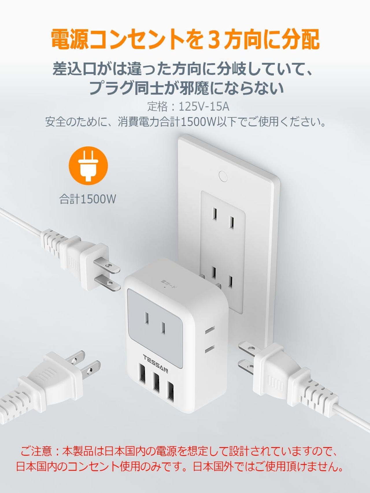 「コンパクトなタコ足コンセント」:手のひらのサイズで、前面・両側面に差し込み口が1口ずつあります。AC電源口を3方向に分配できる設計なので、コンセント同士の干渉を防ぎ、すっきりとした配線を実現できます!(AC定格出力:合計1500W;125V/15A)*ご注意:使用可能地域:本製品は日本国内の電圧(100-125V)を想定して設計されていますので、日本国外ではご使用いただけません。