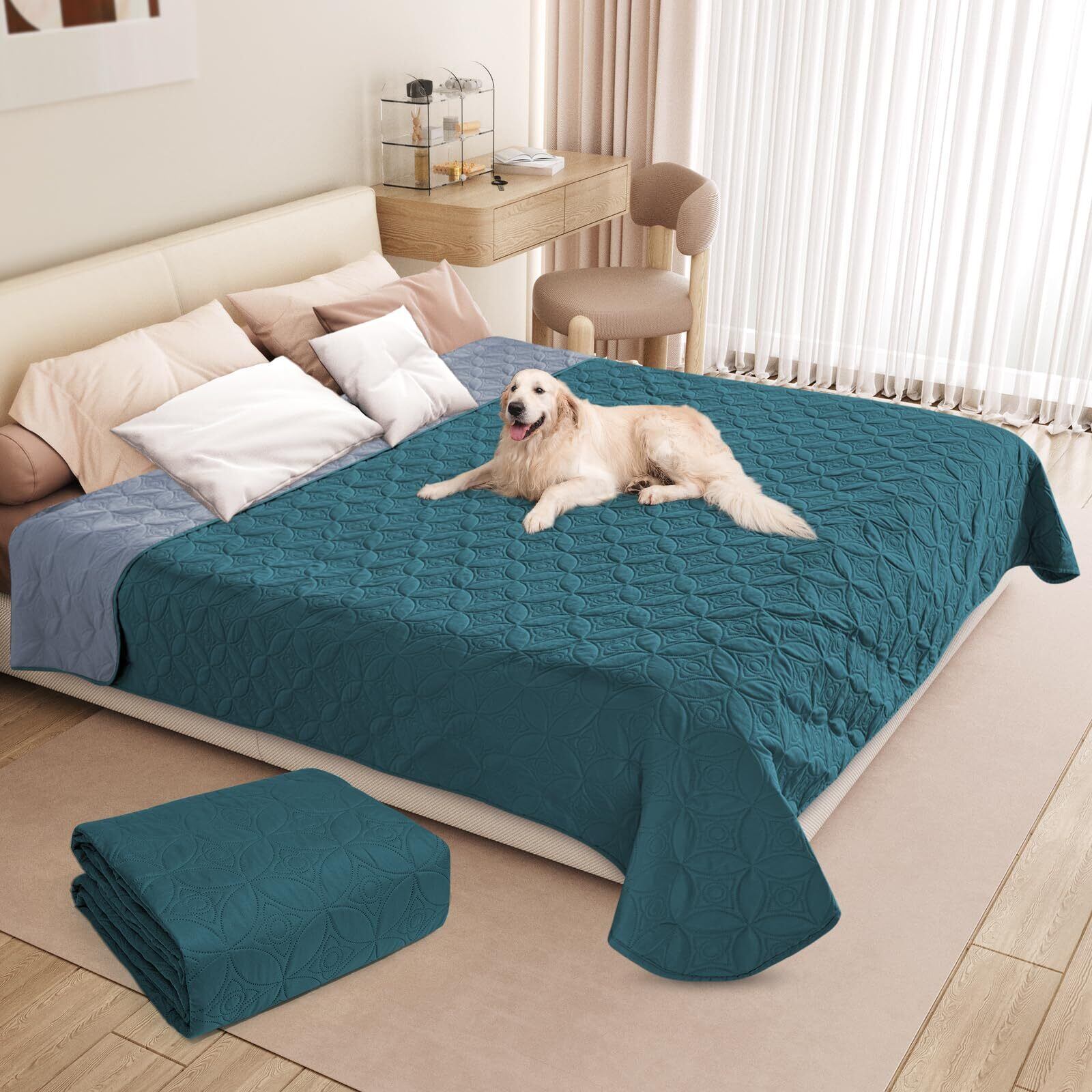 LOOBANI 防水カバー ベッド ソファー 防水シーツ 防水シーツ シングル ダブル ベッドカバー 防水 犬 猫用 防水シーツ 防水 漏れ防止 両面使用 オールラウンドカバー 繰り返し使える 噛み耐性 速乾 防ダニ 制菌 大判 おねしょシーツ 尿失禁 ペット粗末対策 ベビー 高齢者 介護用 (ティール&グレーブルー, 208cm*208cm)
