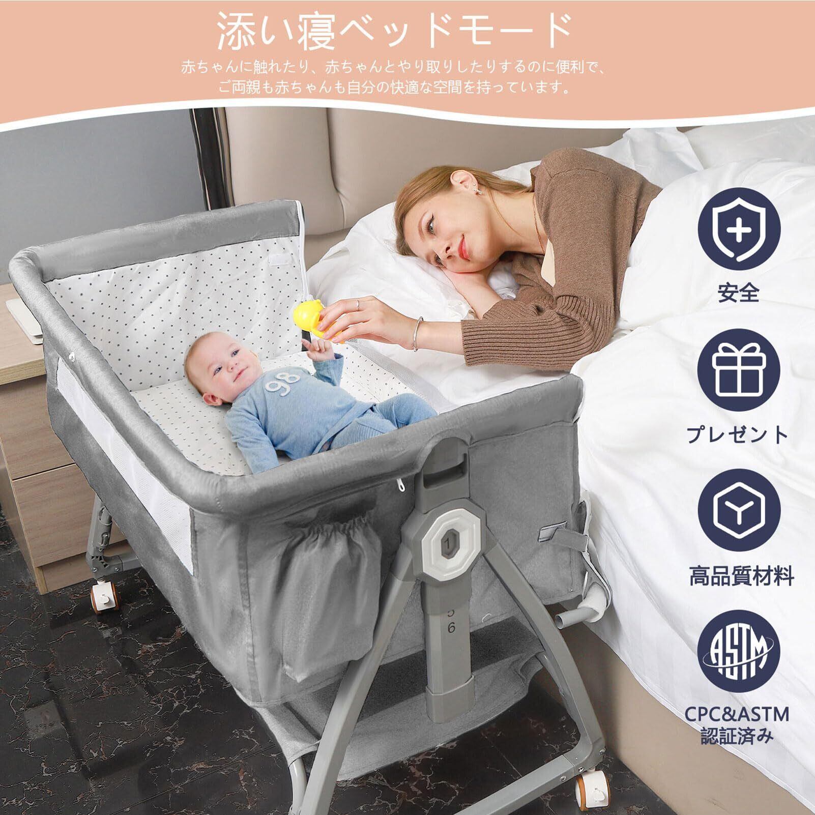 【6段高さ調節・添い寝モード】高さ6段階調節可能で、各高度の大人ベッドに合わせてご利用可能です。サイドの囲いを取り外して、添い寝ベッドにもなり、固定ストラップで両親のベッドサイドに安全かつ安定的に固定することができます。赤ちゃんに触れたり、赤ちゃんとやり取りしたりするのに便利で、ご両親も赤ちゃんも自分の快適な空間を持っています。一方の高さだけを調節してベビーベッドを傾けることもでき、赤ちゃんの吐くことを防ぐことができます。