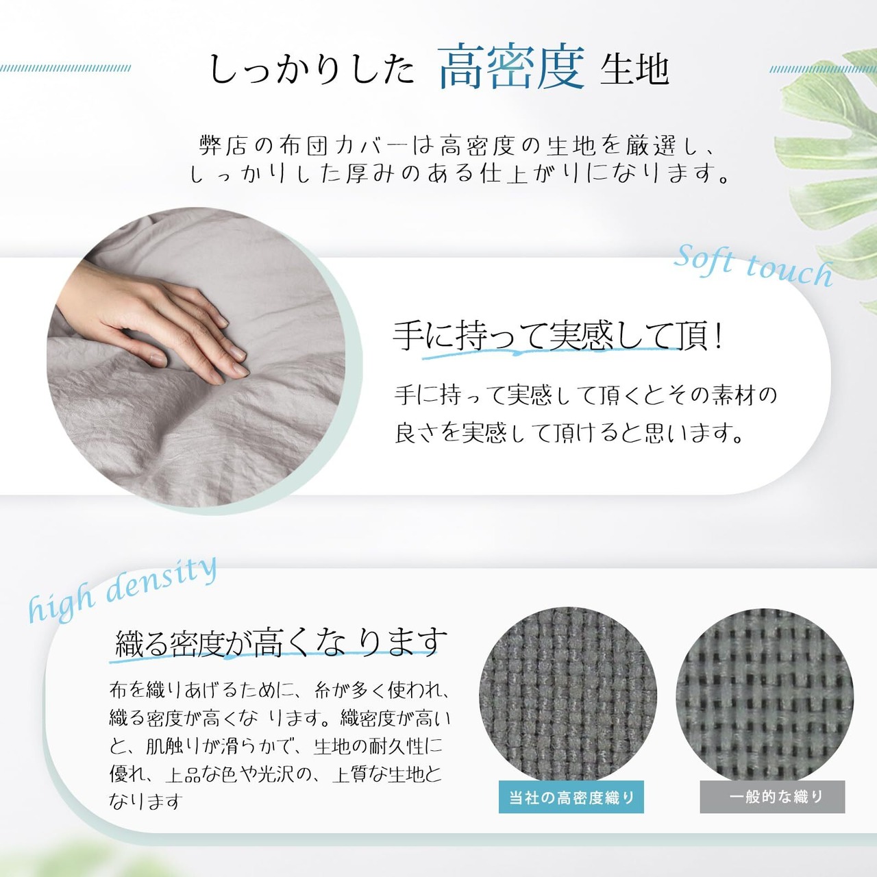 【洗いざらし+極柔な肌触り】:掛け布団カバーの生地を何度も洗って自然な風合いがでて更にピーチスキン加工して最初から肌になじむように仕上げました。洗濯ごとにもっと柔らかくなり、毛玉やほつれができにくく、静電気も少ないので、耐用性がよい長く愛用できます。