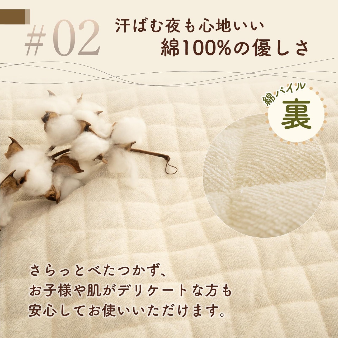 【4か所ゴム付き】四隅にゴムバンドを装備し、寝返りや動きによる布団とのずれを最小限に抑えます。通常のゴムバンドに比べて、洗濯や長時間の使用でも伸びにくい特殊強化ゴムを採用しています。ベッドのマットレスや和布団といったさまざまな寝具との組み合わせに適しており、安定感のある睡眠環境を提供します。