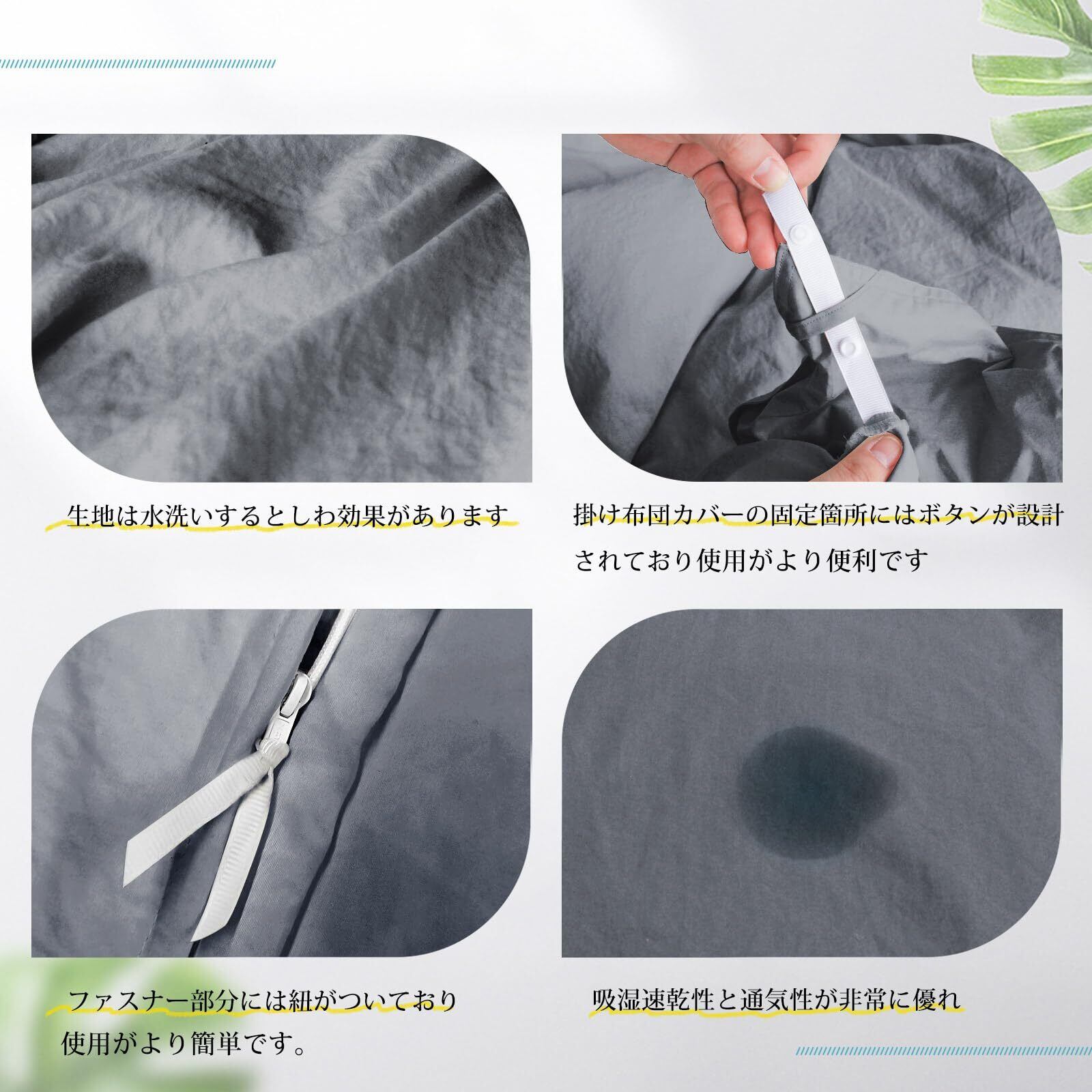 【オールシーズン向け】暑い季節は汗を吸いやすく、寒い季節は保温性に優れています。また通気性もよい、汗をかいても素早く湿気を吸い取り、発散してくれるので、いつでもサラサラとしています。この掛け布団カバーは一年を通じてお使いいただけます。