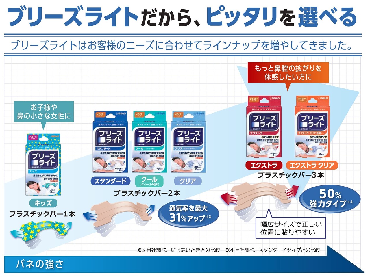 ブリーズライトを正しい呼吸で、快適な睡眠をサポートします。 プラスチックバーの反発力で、鼻腔を拡げ鼻の通りをよくする鼻孔拡張テープです。