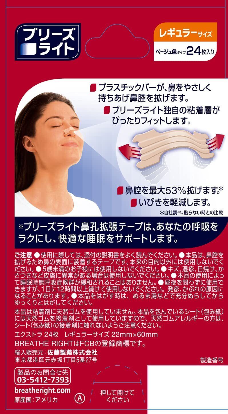 【商品説明】 「ブリーズライト エクストラ 肌色 レギュラー」は、プラスチックバーの反発力で鼻腔を拡げて、鼻のとおりをスムーズにします。鼻がつまって寝苦しく、良く眠れないとき、鼻の上に貼るだけで鼻の呼吸をサポートします。 鼻からスッキリ、翌朝スッキリ*。 *ブリーズライト鼻孔拡張テープは、あなたの呼吸をラクにし、快適な睡眠をサポートします。 【製品特長】 ・50%強力タイプ ・プラスチックバーが、鼻をやさしく持ちあげ鼻腔を拡げます。 ・ブリーズライト独自の粘着層が、ぴったりフィットします。 ・通気率を最大31%アップ* ・いびきを軽減します。 *自社調べ、貼らない時との比較 【使用上の注意】 ・使用に際しては、添付の説明書をよく読んでください。 ・本品は、鼻腔を広げるため鼻の表面に装着するテープです。本来の目的以外に は使用しなでください。 ・5歳未満のお子様には使用しないでください。 ・キズ、湿疹、日焼け、かさつきなど皮膚に以上がある場合は使用しないでください。 ・本品の使用によって睡眠時無呼吸症候群が緩和されることはありません。 ・昼夜を問わずに使用できますが、1日12時間以上続けて使用しないでください。発疹、かぶれの原因になることがあります。 ・本品をはがす時は、ぬるま湯などで充分ぬらしてからゆっくりとはがしてください。 ・本品は粘着剤に天然ゴムを使用していません。本品を包んでいるシート(包み紙)には天然ゴムを接着剤として使用していますので、天然ゴムアレルギーの方は シート(包み紙)の接着剤に触れないようにご注意ください。 【使用方法】 1:鼻をよく洗って乾燥させます。 2:中央を鼻の中心に合わせ、ブリーズライトの両側をみつけた位置に合わせます。 3:両側を鼻にそって曲げて、指でさすってしっかりと接着させます。 原材料・成分 ブリーズライト エクストラ レギュラー 肌色 鼻孔拡張テープ 快眠・いびき軽減 24枚入 【お問い合わせ先】 輸入販売元:佐藤製薬株式会社(製品の問合せ先:03-5412-7393) 安全警告 ●ご注意:●使用に際しては、添付の説明書をよく読んでください。 ●本品は、鼻腔を拡げるため鼻の表面に装着するテープです。本来の目的以外には使用しないでください。 ●5歳未満のお子様には使用しないでください。 ●キズ、湿疹、日焼け、かさつきなど皮膚に異常がある場合は使用しないでください。 ●本品の使用によって睡眠時無呼吸症候群が緩和されることはありません。 ●昼夜を問わずに使用できますが、1日に12時間以上続けて使用しないでください。発疹、かぶれの原因になることがあります。 ●本品をはがす時は、ぬるま湯などで充分ぬらしてからゆっくりとはがしてください。 ●本品は粘着剤に天然ゴムを使用していません。本品を包んでいるシート(包み紙)には天然ゴムを接着剤として使用していますので、天然ゴムアレルギーの方は、シート(包み紙)の接着剤に触れないようご注意ください。 ご注意(免責)>必ずお読みください こちらの商品はポスト投函(追跡あり)での発送になります。盗難、箱つぶれ等のがございません。あらかじめご了承ください。