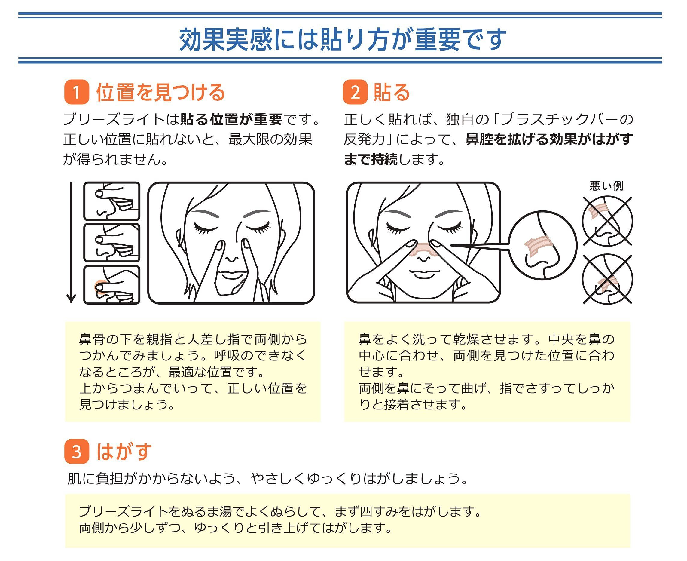【使用方法】 1:鼻をよく洗って乾燥させます。 2:中央を鼻の中心に合わせ、ブリーズライトの両側をみつけた位置に合わせます。 3:両側を鼻にそって曲げて、指でさすってしっかりと接着させます。