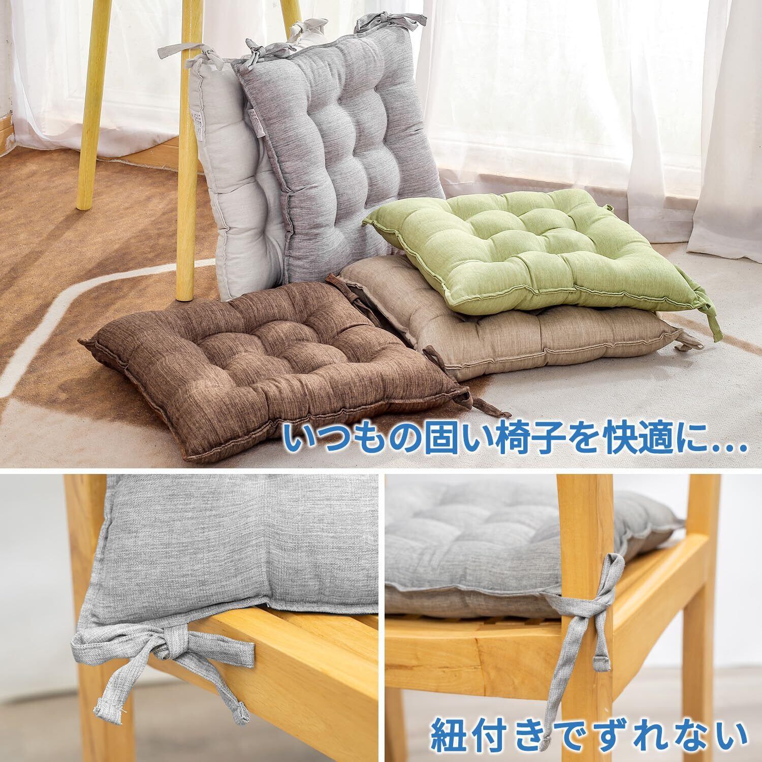 【紐付きでずれない】紐付きのシートクッションで、お家のダイニングチェアや、職場のPCチェアなどを使いやすく!動かすことの多いダイニングの椅子でも、紐付きだから、固定出来て、ズレません。