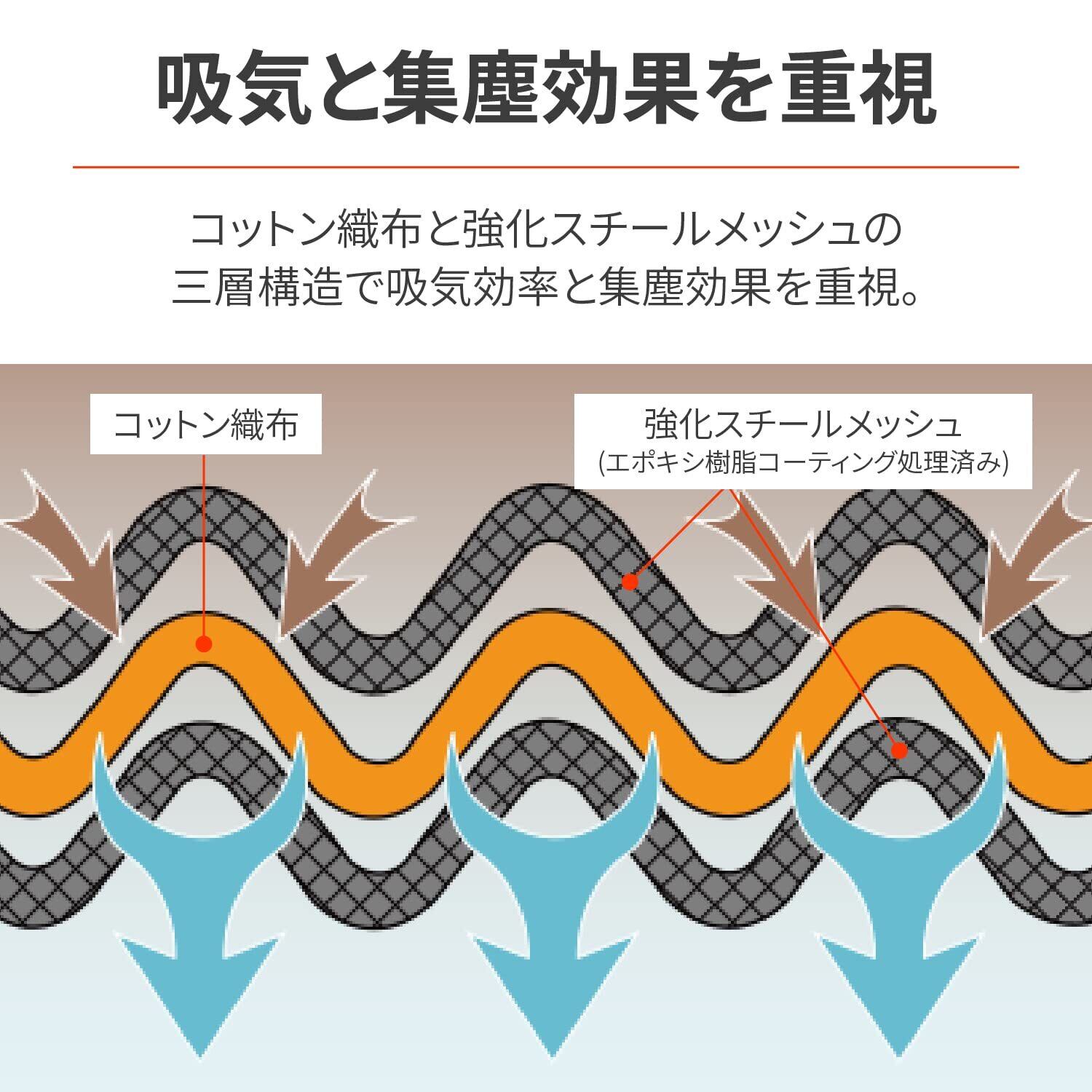 「吸気効率と集塵効果を重視したコットン織布」と「エポキシ樹脂コーティング処理した強化スチールメッシュ」の三層構造