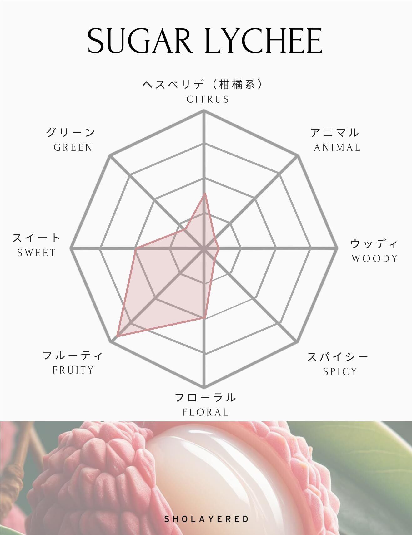 砂糖に浸らせたライチのフレッシュでジューシーなフルーティな印象、そしてそこに同居するライチ特有のちょっとした渋い印象。