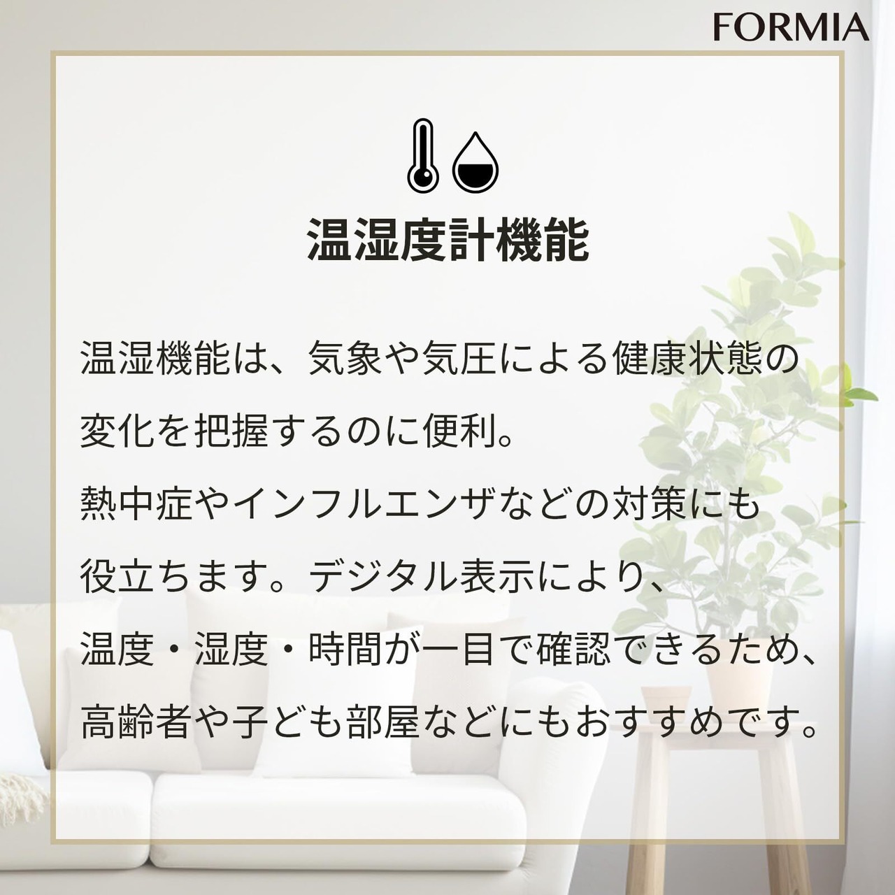 温湿機能は、気象や気圧による健康状態の変化を把握するのに便利で、熱中症やインフルエンザなどの対策にも役立ちます。デジタル表示により、温度・湿度・時間が一目で確認できるため、高齢者や子供部屋などにも。