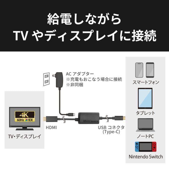 ・「充電しながら」大画面で観る!PDポート搭載USB Type-C to HDMI変換ケーブル ・100W対応の給電用PDポート搭載(PD3.0対応) ・4K60Hz、HDR対応、拡張モードにも対応でデスクワークにも便利 ・映像出力対応のUSB Type-Cポートを装備したスマホ、タブレット、Windows PC、Mac、iPad、Chromebookに対応 ・iPhone15シリーズ、Nintendo Switch、Steam Deck動作確認済み、各種動画配信サービスでの動作確認済み