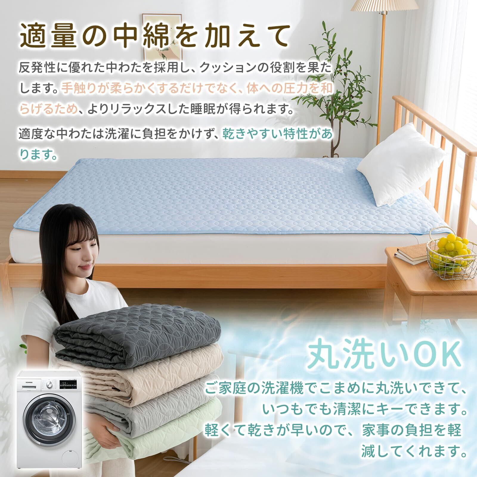 【お肌にやさしい心地】肌に優しい表地は通気性がよく、汗をかいても水分が素早く吸収し、すぐに乾きます。汗をかきやすい夏も快適な使い心地。吸水性と通気性に優れた素材のため、敷きパッドは汗などの水分をたっぷり吸収し、速乾してさらっと快適にお使いいただけます。蒸し暑い夏や、季節の変わり目に活躍します。