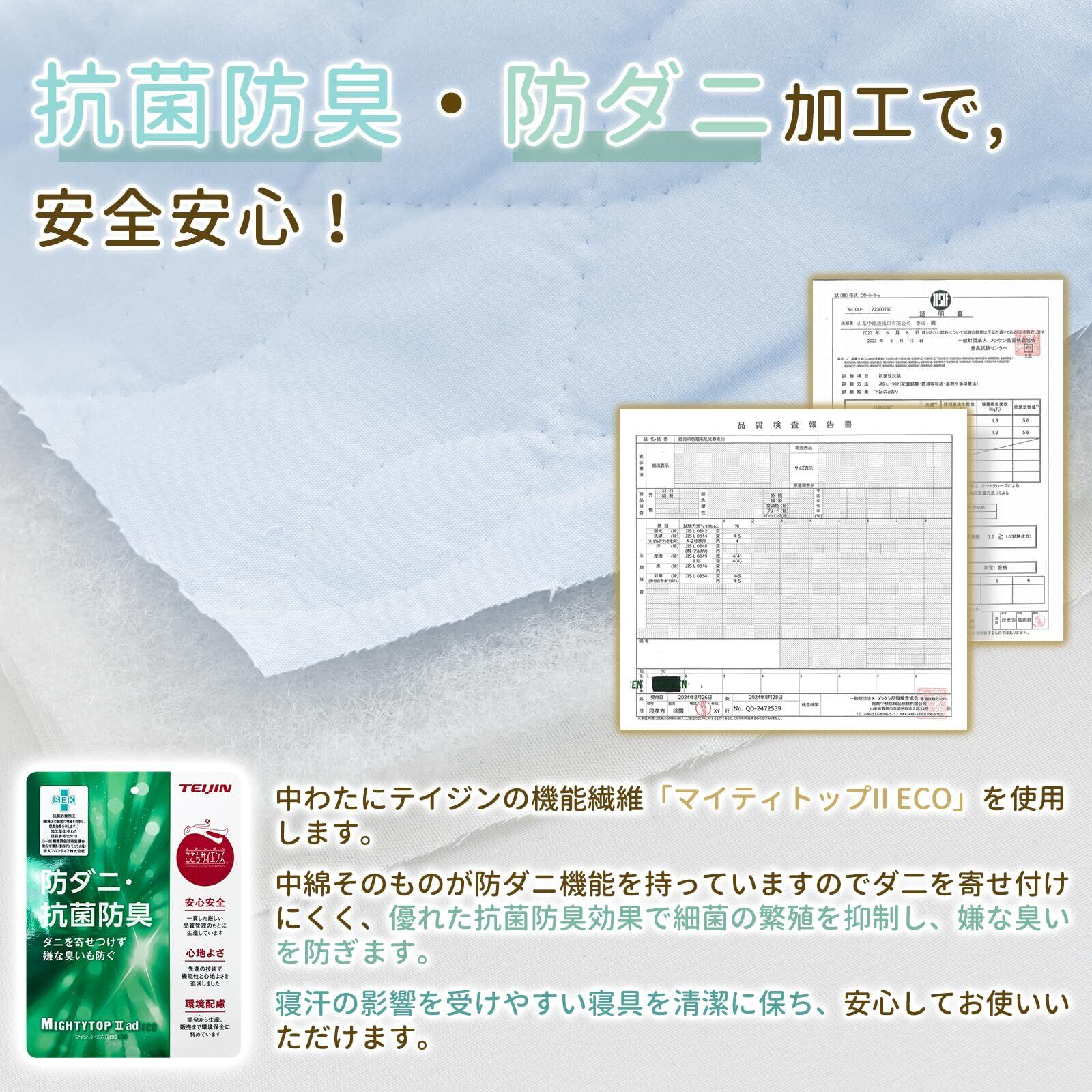【TEIJIN抗菌防臭・防ダニ中綿使用】TEIJIN(帝人)マイティトップⅡ中綿を使用し、SEK認証された優れた抗菌防臭効果で、細菌の繁殖を防ぐ抗菌・いやなに臭いを抑えます。通常の繊維と比べて、洗濯耐久性を実現しています。オールシーズンずっと心地よくお休みいただける品質にもこだわりました。