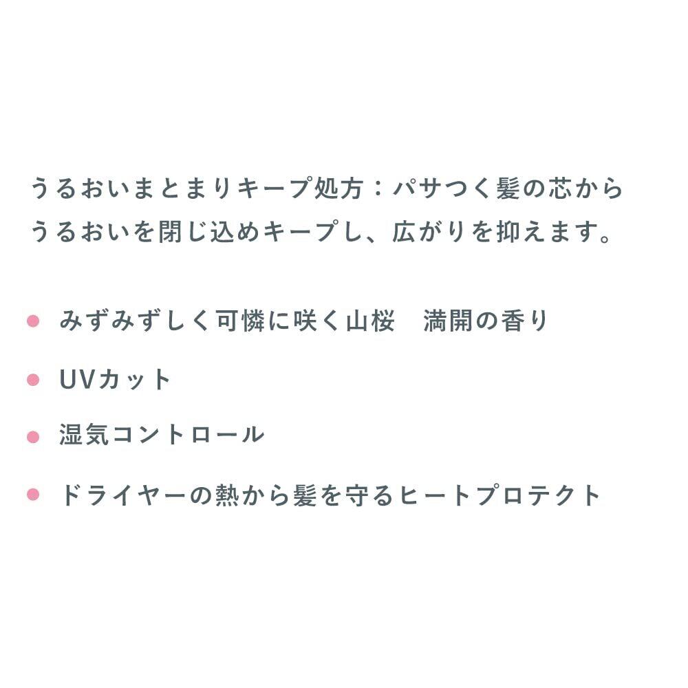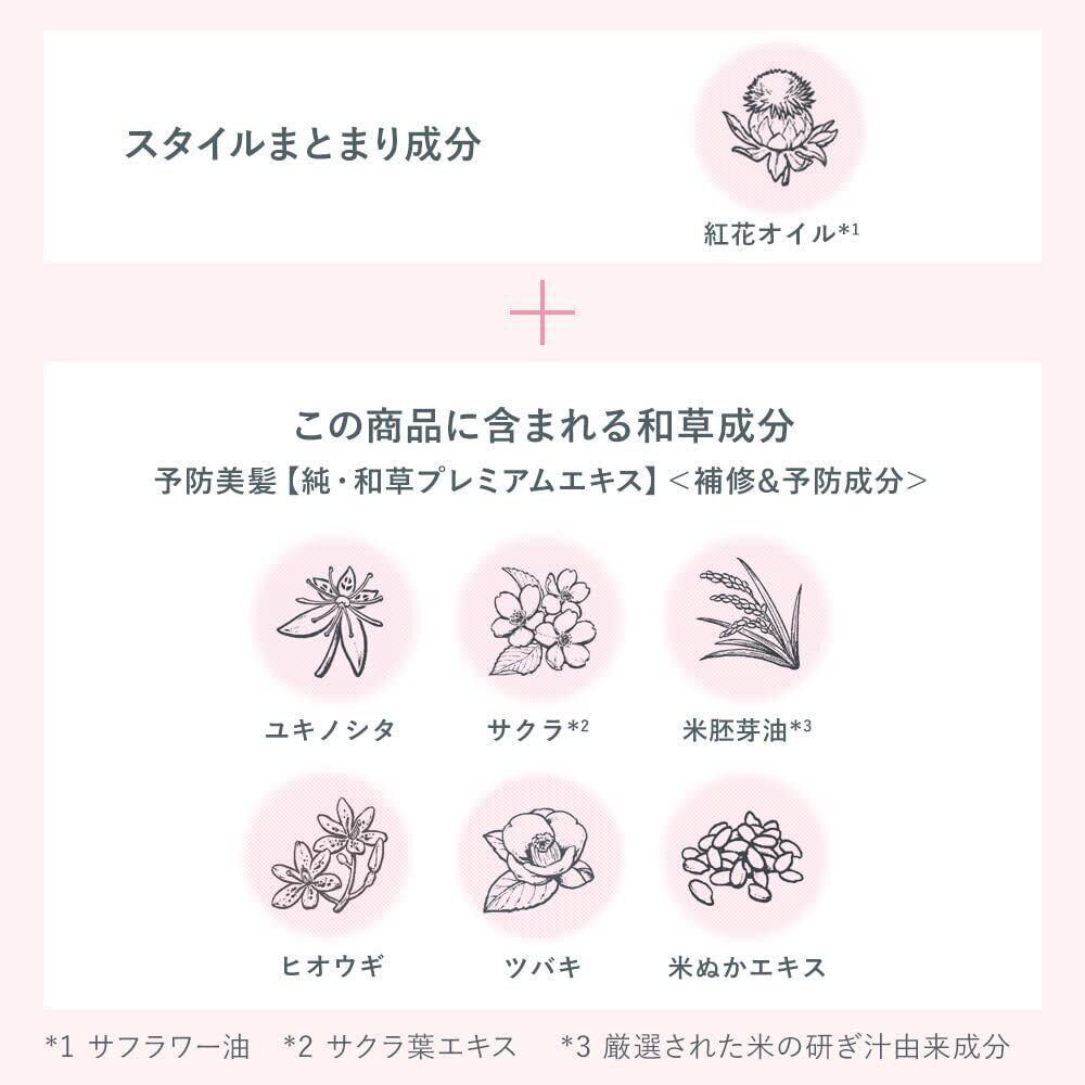 ●日本の髪を本質から考える。●和草のちからでスタイルをつくりながらダメージ補修&予防する予防美髪スタイリングケアシリーズ。●スタイルまとまり成分(紅花オイル※1)配合。●補修&予防成分「純・和草プレミアムエキス※2」配合。●再整髪※3。●UVカット。●ヒートプロテクト、湿気コントロール。●みずみずしく可憐に咲く山桜満開の香り。●うるおいまとまりキープ処方。●パサつき広がる髪もしっとりまとまりここちいい。※1 サフラワー油、※2 ユキノシタ、サクラ(サクラ葉エキス)、米胚芽油(厳選された米の研ぎ汁由来成分)、ヒオウギ、ツバキ、米ぬかエキス、※3 再度手ぐしで整えることで髪のまとまりを出す
