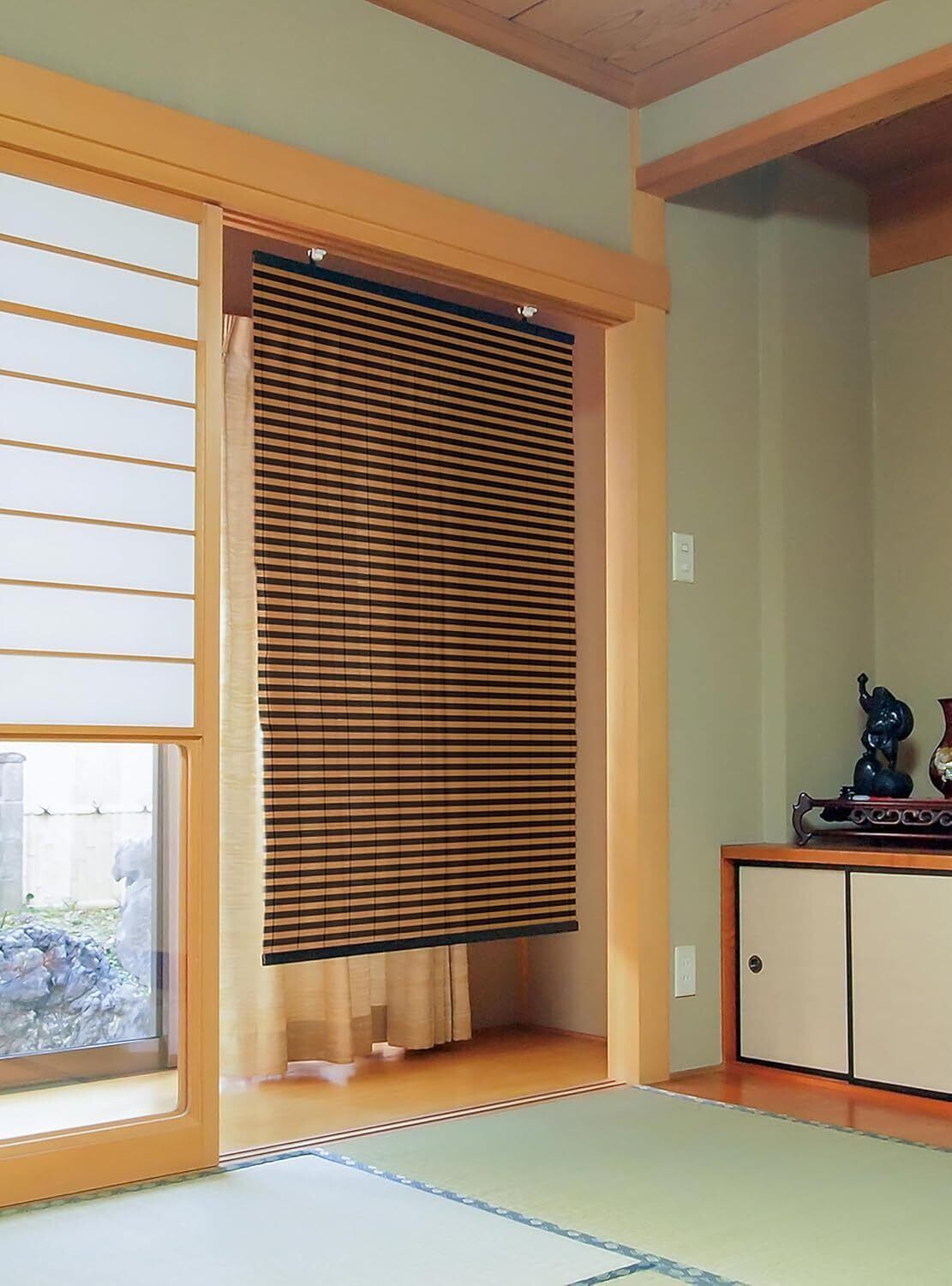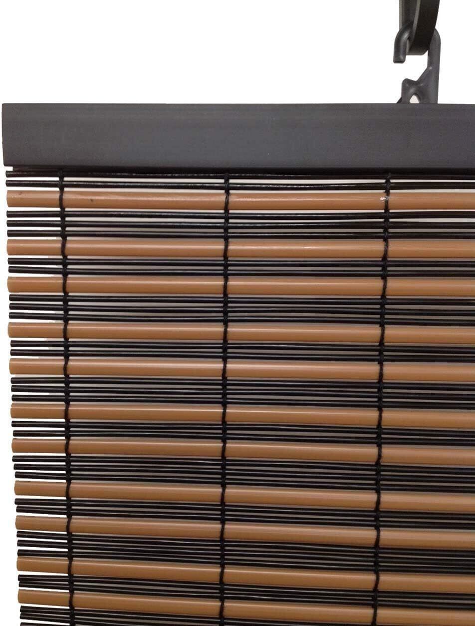 ビニールすだれ:小判型のパイプ(薄茶)と丸パイプ(こげ茶)とを組み合わせたボーダー柄で、和洋室にマッチします