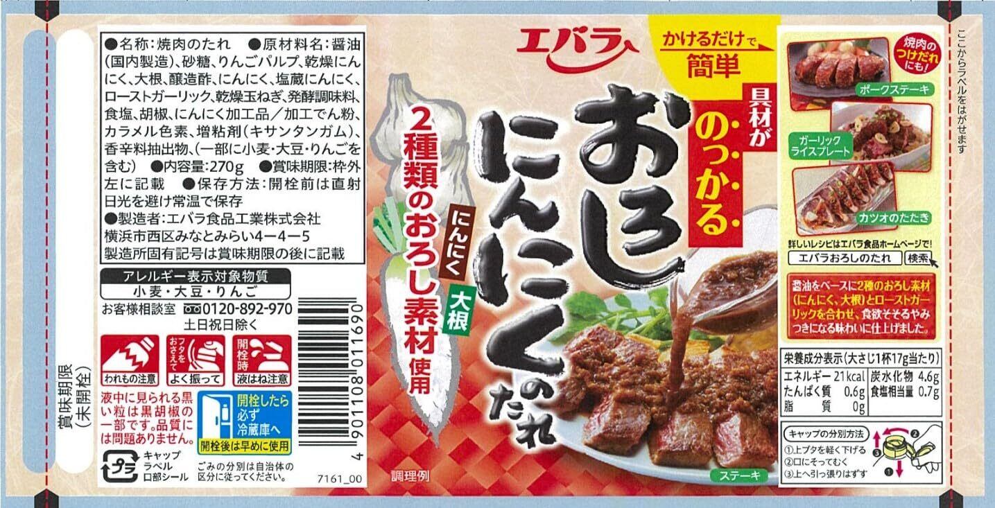 【原材料】醤油(国内製造)、砂糖、にんにく、りんごパルプ、乾燥にんにく、大根、醸造酢、ローストガーリック、乾燥玉ねぎ、発酵調味料、食塩、胡椒/加工でん粉、カラメル色素、増粘剤(キサンタンガム)、(一部に小麦・大豆・りんごを含む)【栄養成分】大さじ1杯17g 当たりエネルギー(kcal)22、たんぱく質(g)0.6、脂質(g)0、炭水化物(g)4.8、食塩相当量(g)0.7【アレルゲン】小麦、大豆、りんご