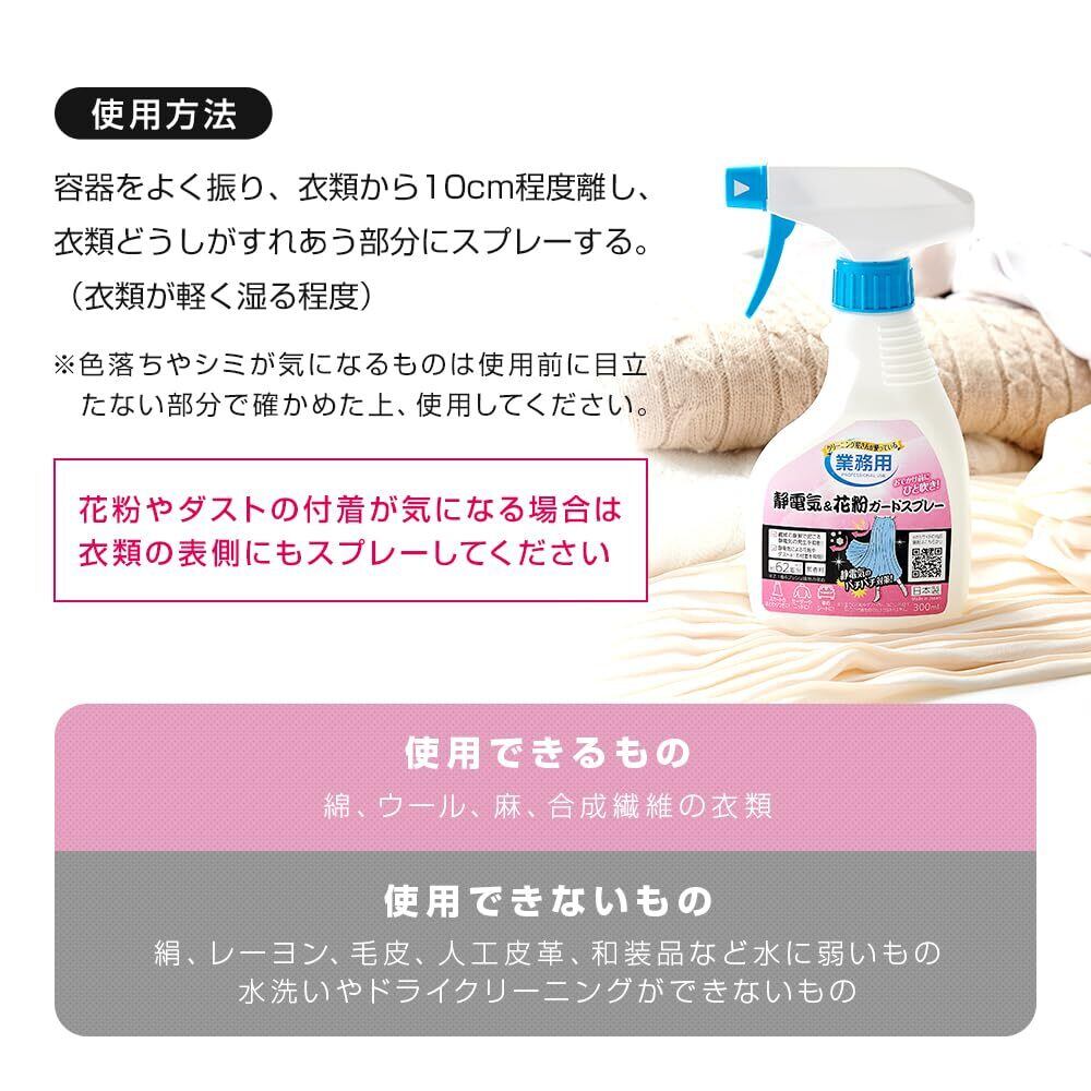 【使用方法】①容器を軽く振り、衣類から10cm程度離れた場所から、衣類どうしがすれあう部分にスプレーする。(衣類が軽く湿る程度)※色落ちやシミが気になるものは使用前に目立たない部分で確かめた上、使用してください。②ホコリや花粉の付着が気になる場合は、衣類の表側にもスプレーする。③1日1回、お出かけ前にスプレーすると効果的。