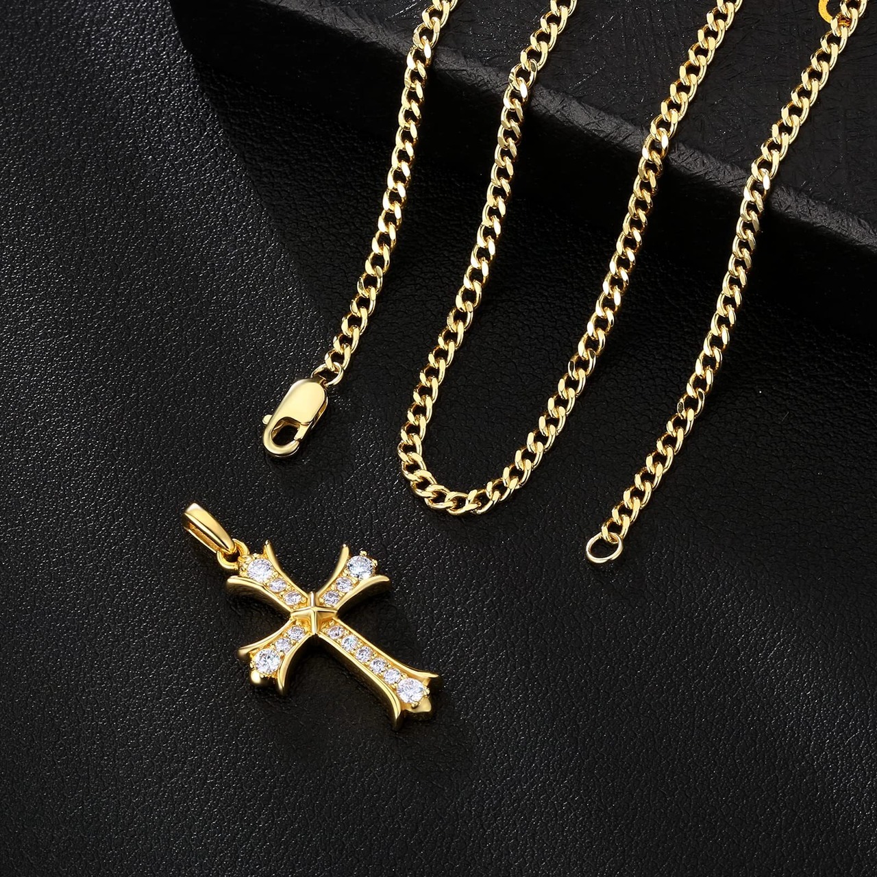 KRKC&CO クロスネックレス メンズ 十字架 ペンダントップ ジルコニア/モアサナイト チェーン付 K14金メッキ 【2点セット】 CZダイヤ キラキラ チェーンネックレス ヒップホップ 人気 プレゼント