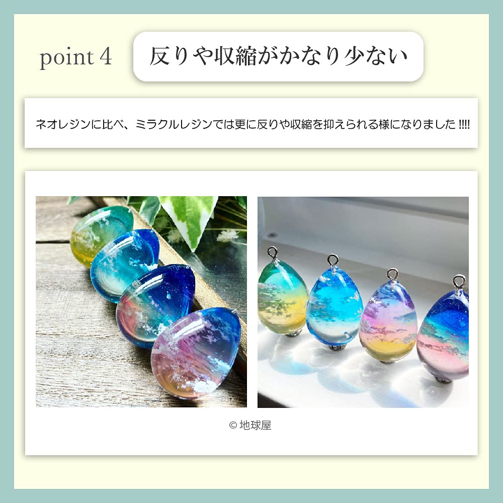 『驚きの透明度&難黄変』ガラスのようなクリアな透明度で誰もが驚きます!初期硬化時に若干黄変しても、ミラクルレジンジンは太陽光に当てれば当てるほど透明度がアップします!ネオレジンよりも透明度アップ!窓際直射日光下の状況下でも、黄変せずに綺麗なガラスのような透明な状態を保っています。