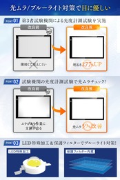 【目や身体への配慮】 色温度の調整を行い ライトボックス の光の刺激的な青みを緩和しつつ明るさを保ち、負荷低減の対策を行いました。 ブルーライト の対策も行うことで目へ有害と言われている光を和らげ、身体への負担を考慮しています。■ LED ライト は長寿命(50,000時間)、低消費電力(USB供給)で熱くならない特徴があります。