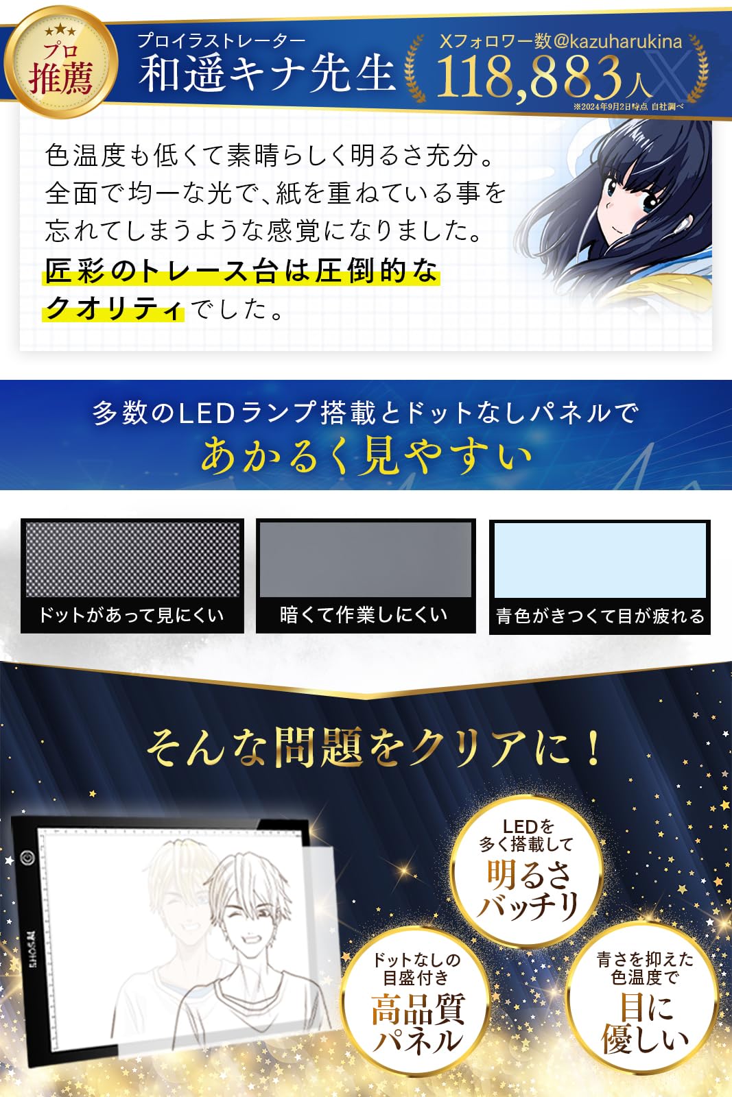 【プロ推薦の高品質モデル】 LEDライト を多く搭載し 高輝度 を実現。 ドットなしの 高品質パネル による全面発光で、均等な明るさとちらつきを軽減した快適な作業環境を提供します■ボタンの長押しで 無段階調整 ができ、タッチ感度も良好ですので ストレス なく調節できます。トレース用紙の厚さに応じて明度調整するのがおすすめです。