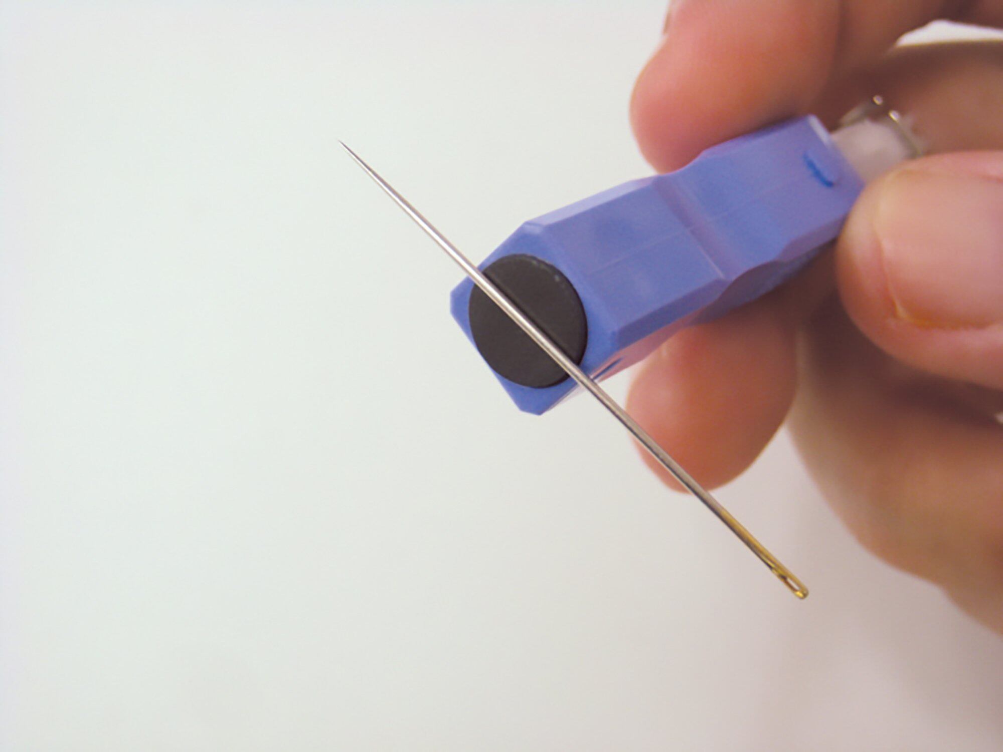 ミシン針にそって、軽く押すだけの簡単操作で糸を通すことができます