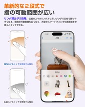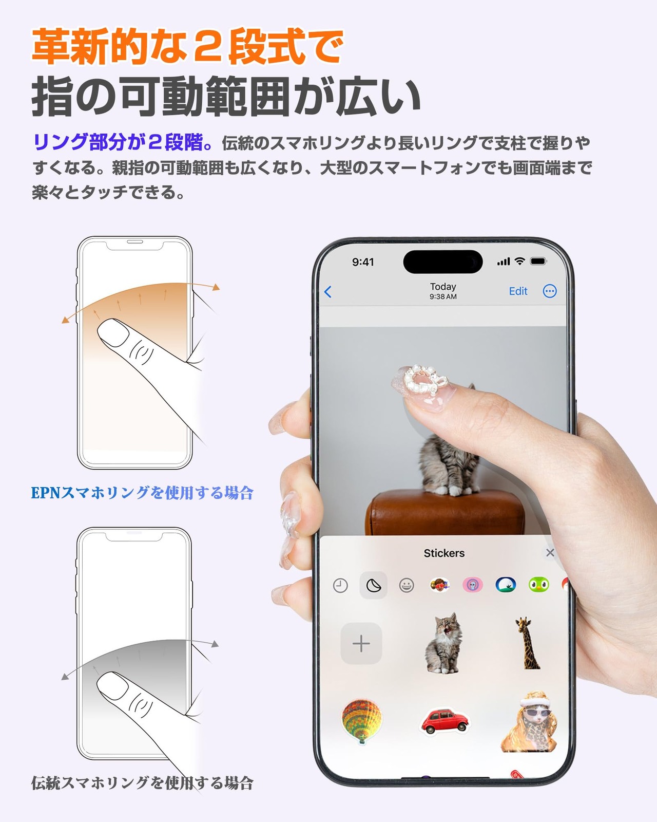 【画期的な2段式・指の可動範囲が超広!!】:EPN2023年末新登場のマグネット式のスマホリングは、革新的な2段階リングを採用。人体工学に基づいた長いリング設計で、握りやすくなし、伝統のスマホリングより指の可動範囲が約2倍上げるほどに広くなったことを実現します。大型のスマートフォンでも片手で画面端まで楽々とタッチできます!リング部内側は滑らかなエッジ仕上げで、どの角度から指を入れても痛くなりにくく、長時間の使用でも苦にならないデザインです。