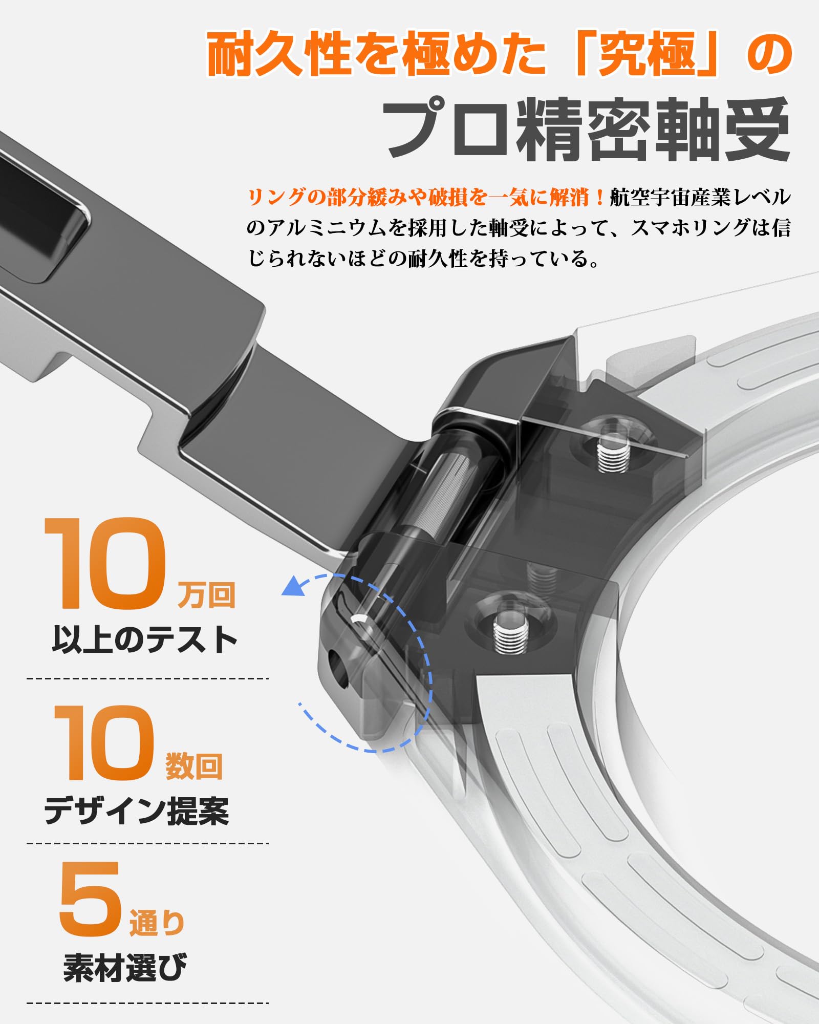 【耐久性を極めた「究極」のプロ精密軸受】:リングの部分緩みや破損を一気に解消!従来モデルは、回転軸の周りがプラスチックを多用していたため、使い込むうちに割れたり緩んだりしやすいです。本製品は、回転軸の周りに航空宇宙産業レベルのアルミニウムを採用、強化処理で従来品に比べて約10倍の長寿命化になり、圧倒的な耐久性と強度を実現されます。材質・形状・加工に徹底的にこだわり、スマホを快適に操作するように仕上げます。