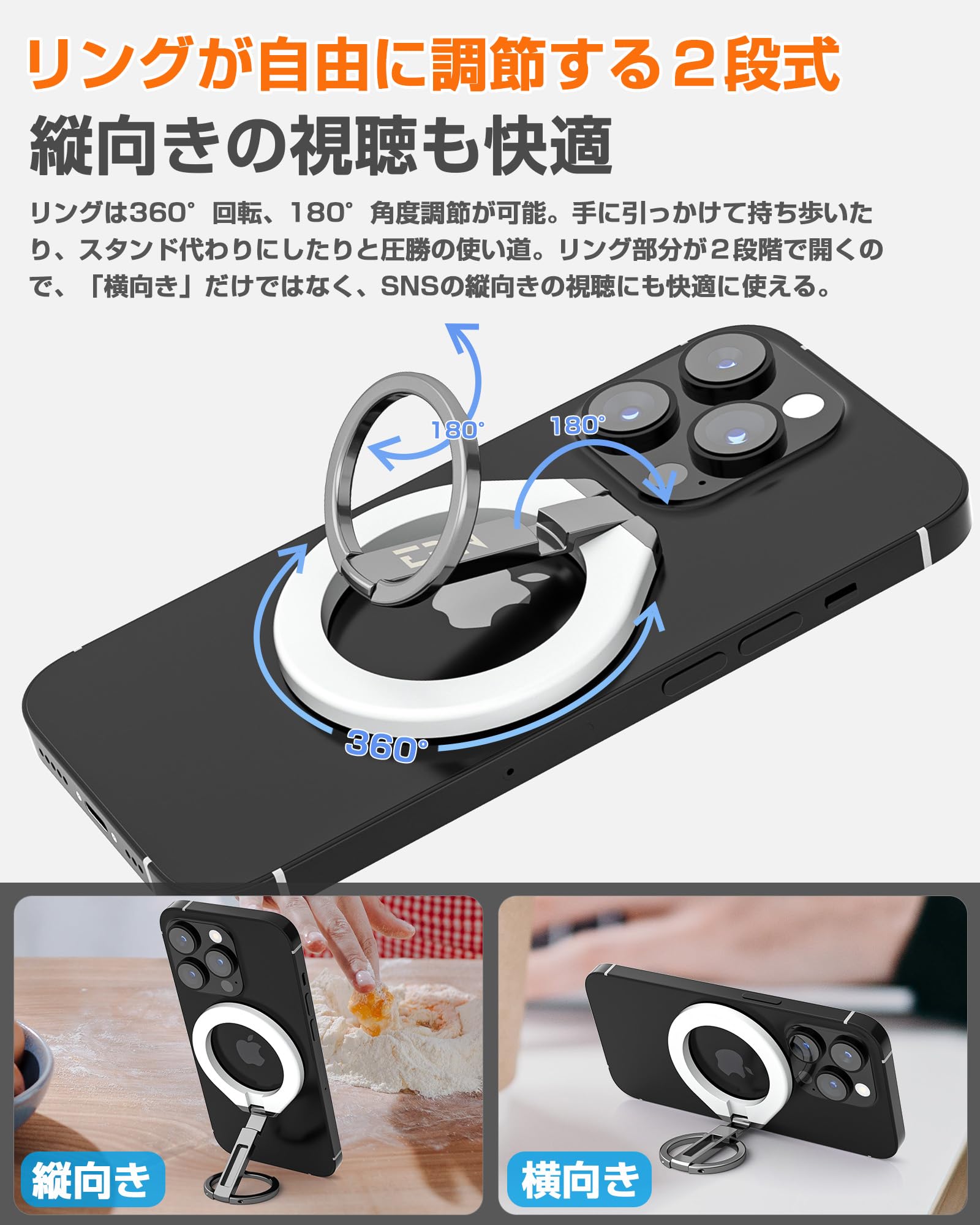 【2025年新登場・革新的な2段式・360°回転式】 EPN マグネット式 スマホリング MagSafe対応 携帯リング バンカーリング 薄型 スマホスタンド機能 落下防止 取り外し可能 iPhoneシリーズ/Android全機種 磁気増強 メタルリング付き