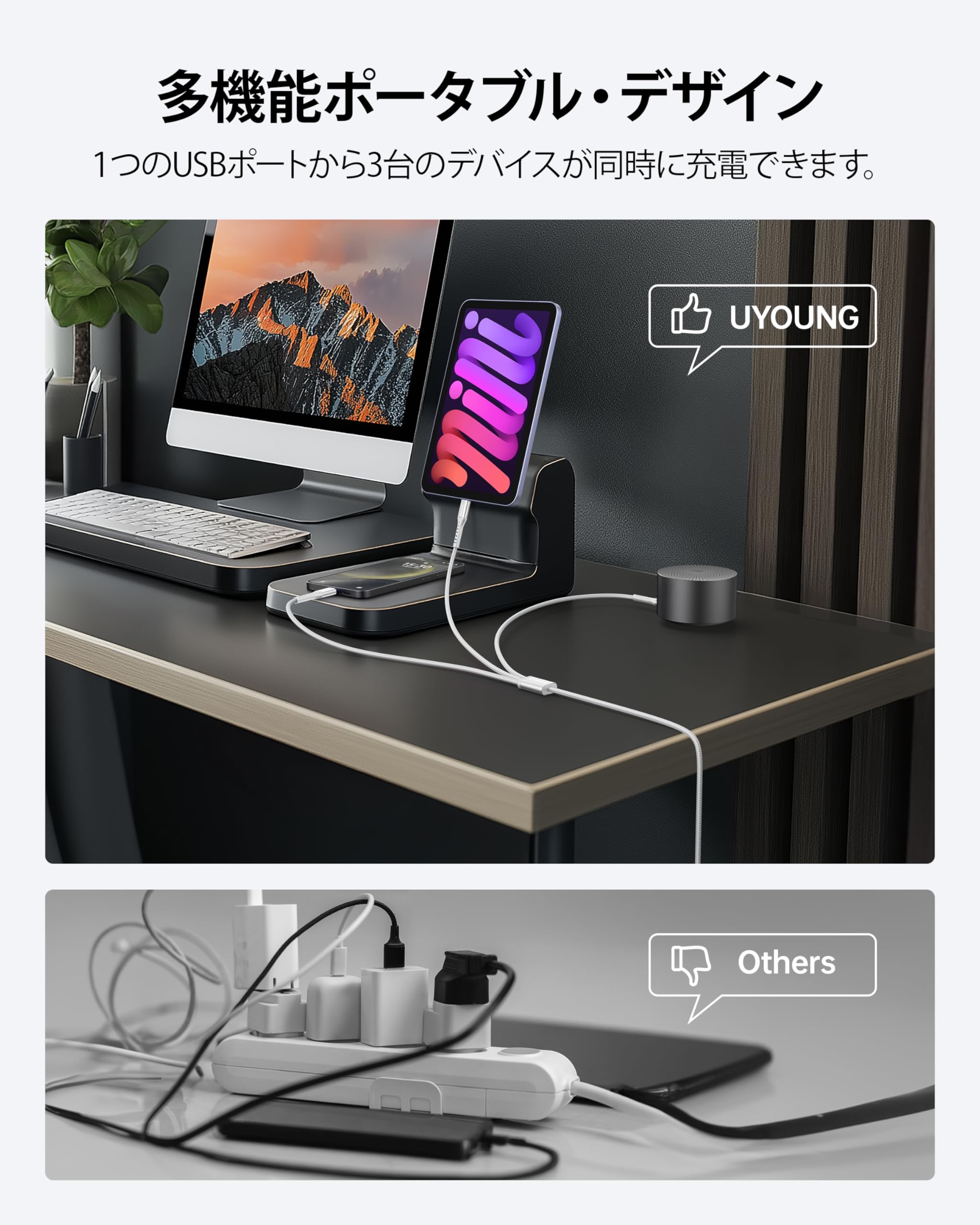 【3台同時充電 】1つのUSBポートから3台のデバイスが同時に充電できます。ライトニングデバイス、Type-C機器、マイクロUSB機器を対応し、3台接続機器へ同時に急速充電を対応します、充電スピードも早くて 本当に便利です。