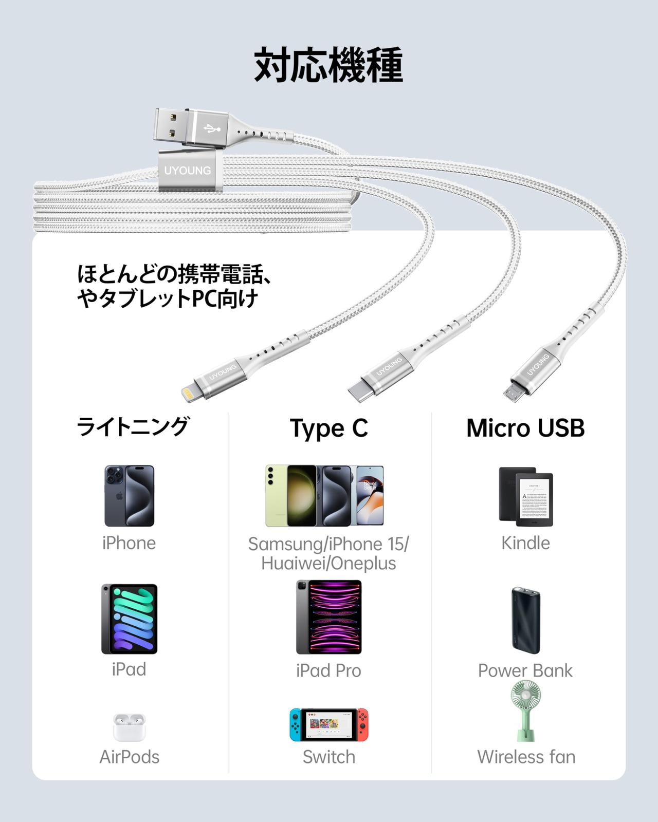 【対応機種・幅広い互換性】3in1 多機能ケーブルはほぼ全設備にphone対応できます。ライトニング端子・Type C端子やMicro USB端子搭載のスマホ・タブレット・イヤホン等のUSB周辺機器を対応します。