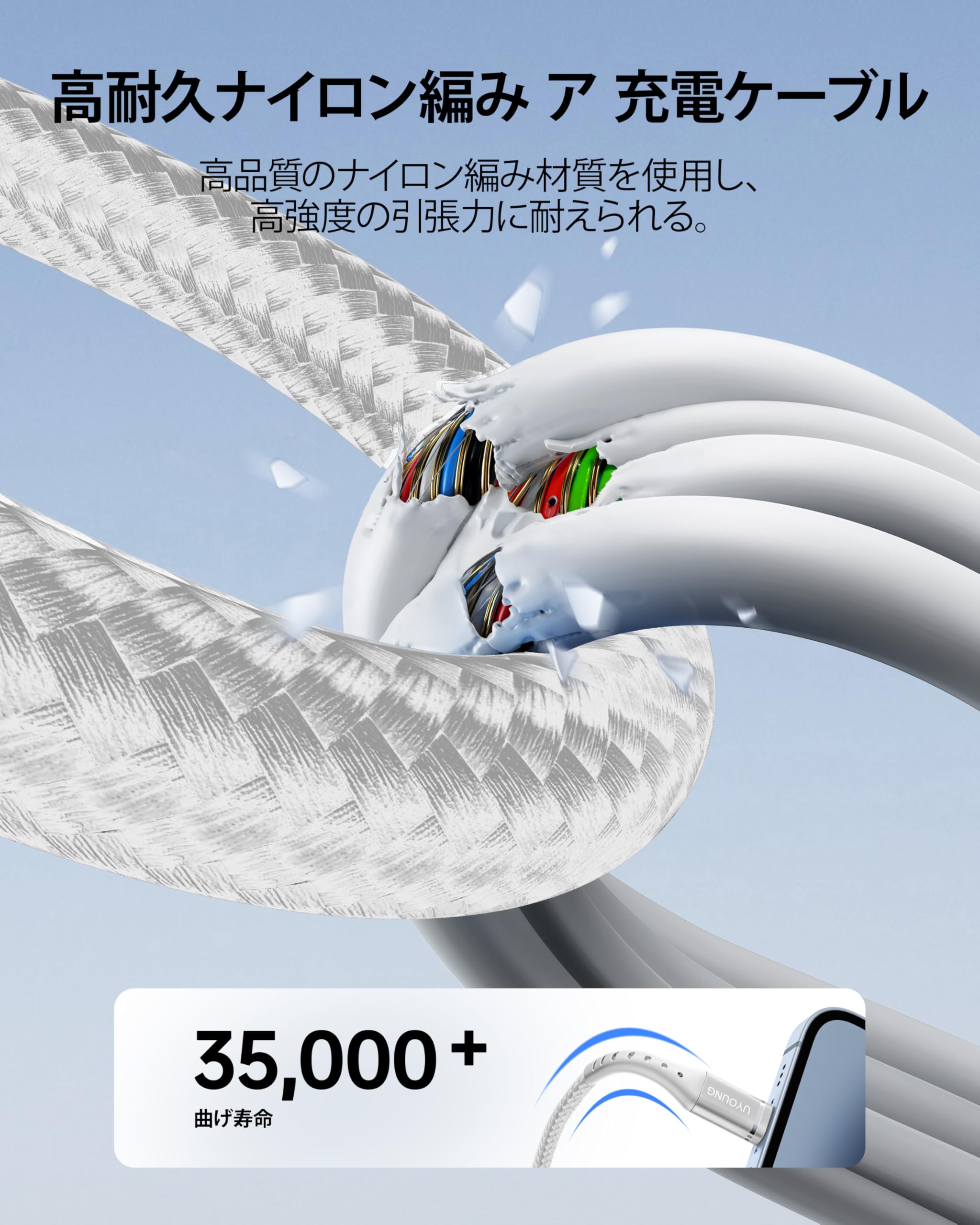【高耐久ナイロン&断線防止設計】柔軟性と耐久性を兼ね備えた二重編込高耐久ナイロン素材を採用、iPhone充電ケーブルがより頑丈で柔軟になります。根元強化デザイン、10000回以上の折り曲げテスト、普通のケーブルより長い使用可能です。