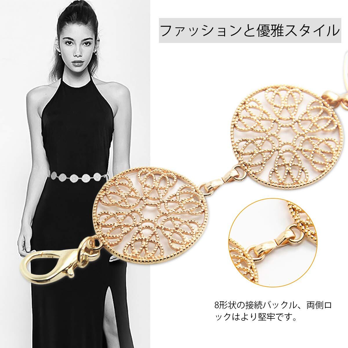 【ファッション小物】この実用的なベルトを希望の服と完全に合わせることができます。それはワードローブに不可欠な小物です。また、ボディチェーンにすることもできます。光沢のある金属チェーンが肌のトーンと良い体型を引き立てます。