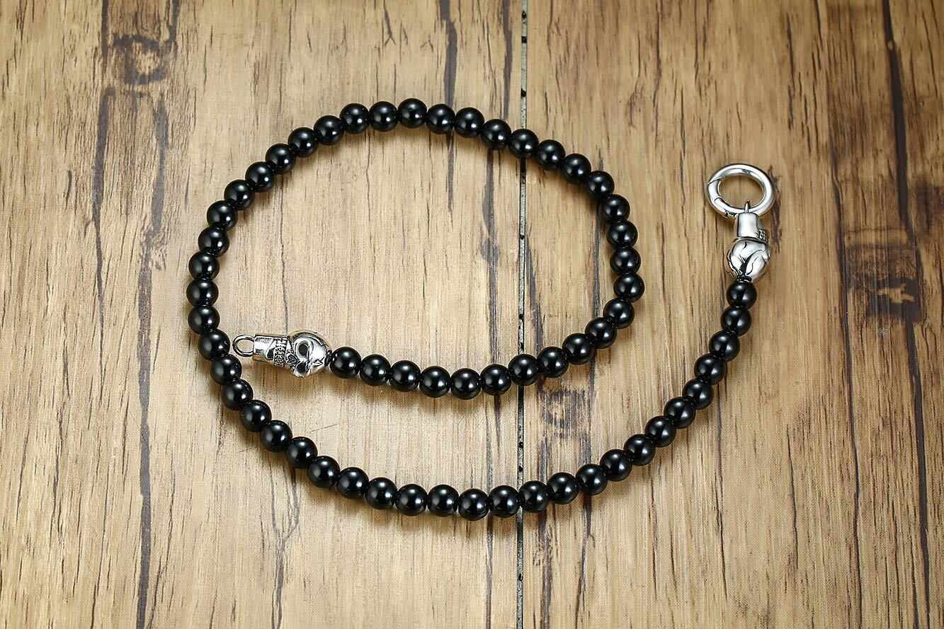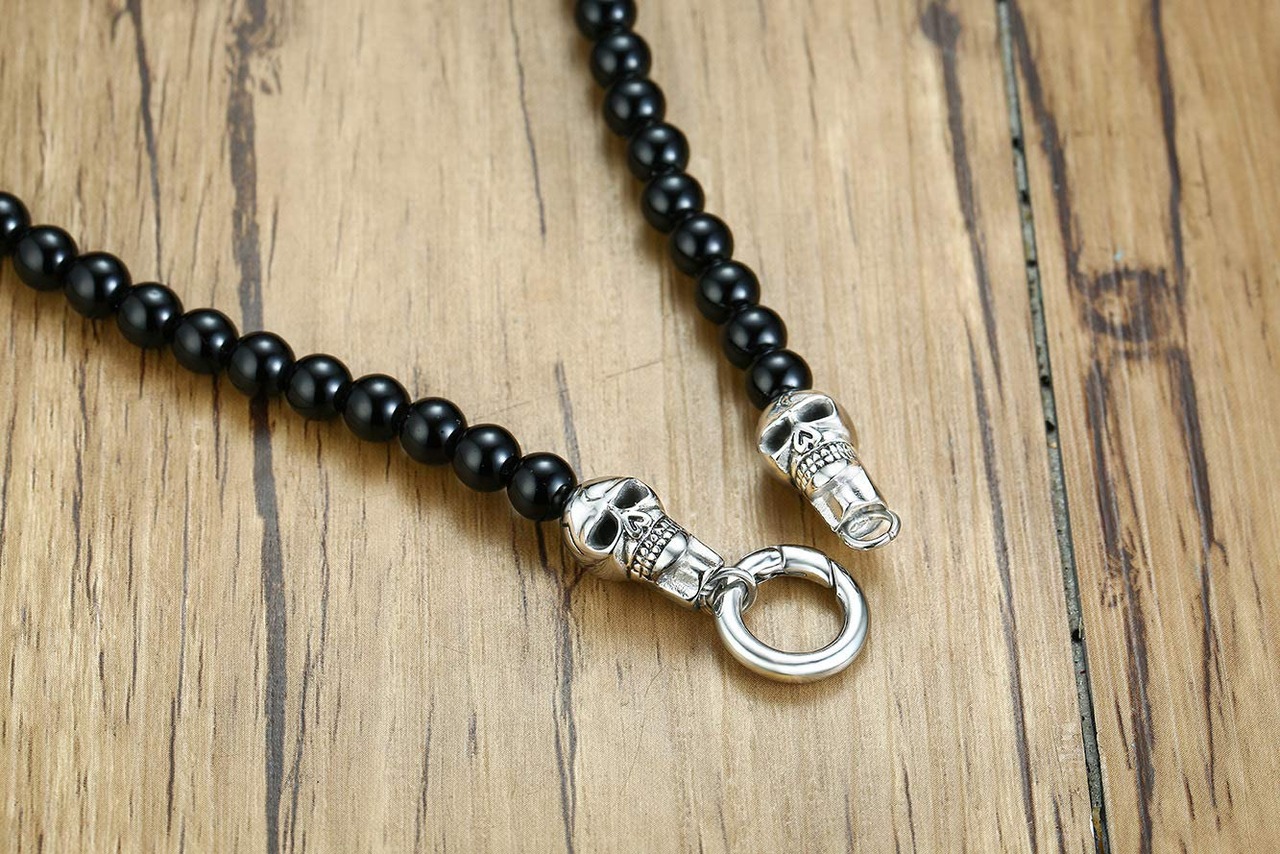 Rockyu ビーズネックレス メンズ ブラックオニキスビーズ 8mm ダブルスカルリング ペンダント シルバーステンレススチール 24インチ 宝石ジュエリー