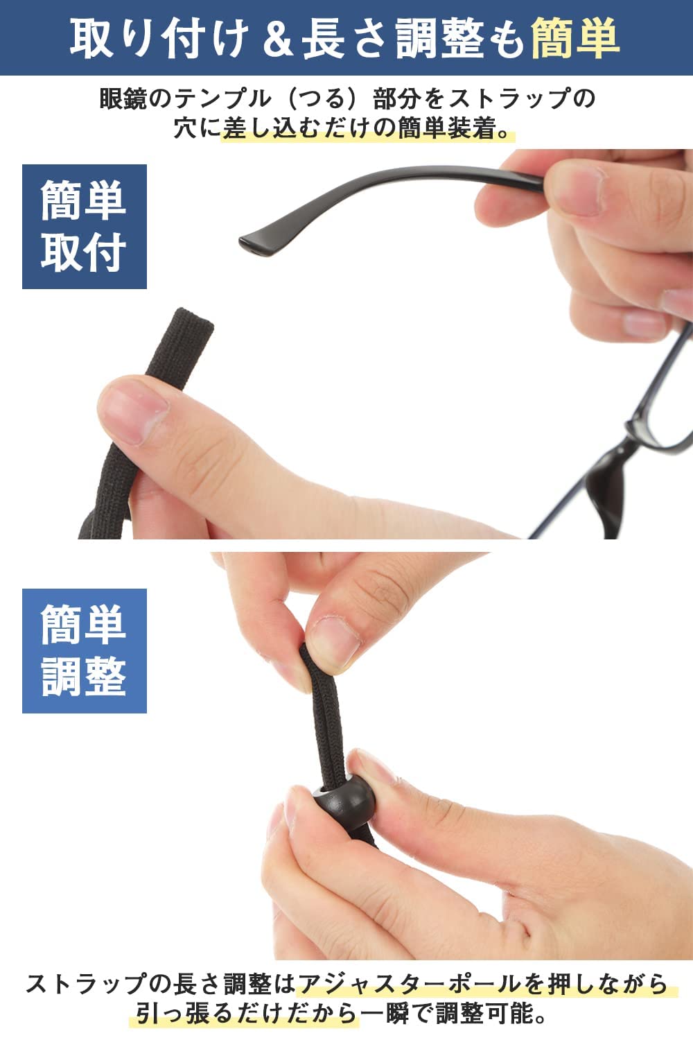 【取り付け簡単】眼鏡のテンプル(つる)部分をストラップの穴に差し込むだけの簡単装着。ストラップの長さ調整はアジャスターポールを押しながら引っ張るだけだから一瞬で調整可能。