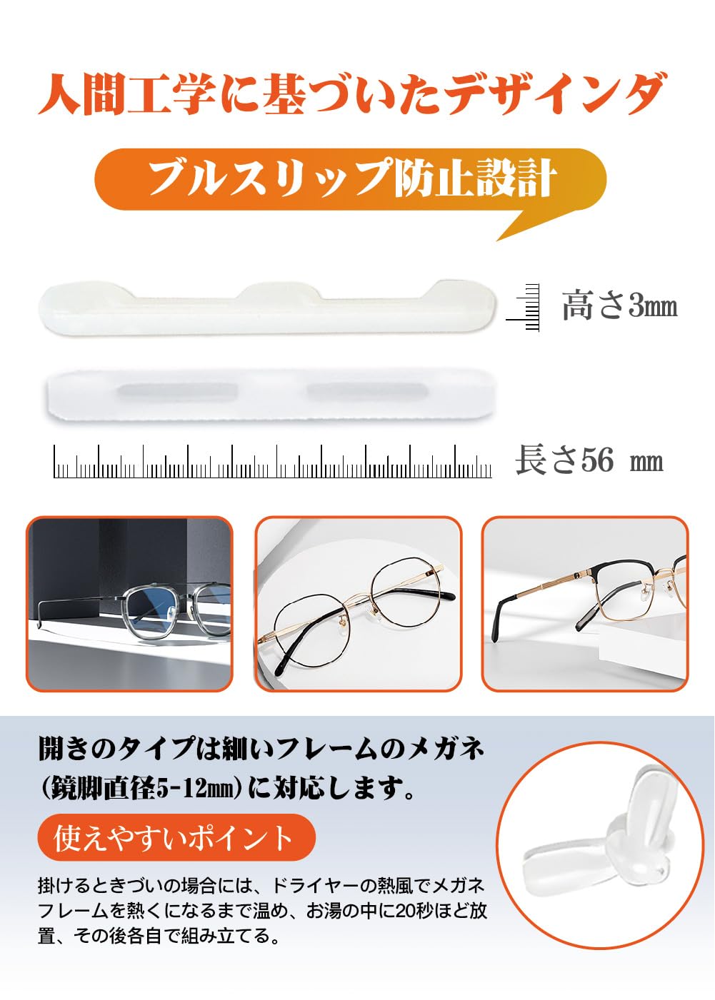 【人間工学に基づいて設計】人間工学に基づいて設計されるので、耳元にぴったりフィットし、長時間使用しても眼鏡の固定を確保し、すり落ち防止でき、快適な履き心地を提供します。普段の生活や、スポーツをする際に、煩わしいメガネのずれ落ちをしっかり固定します。もう一方は日常生活やデスクワーク等の際に、ちょっとしたずれ落ち防止や耳の痛みからの保護に活躍します。