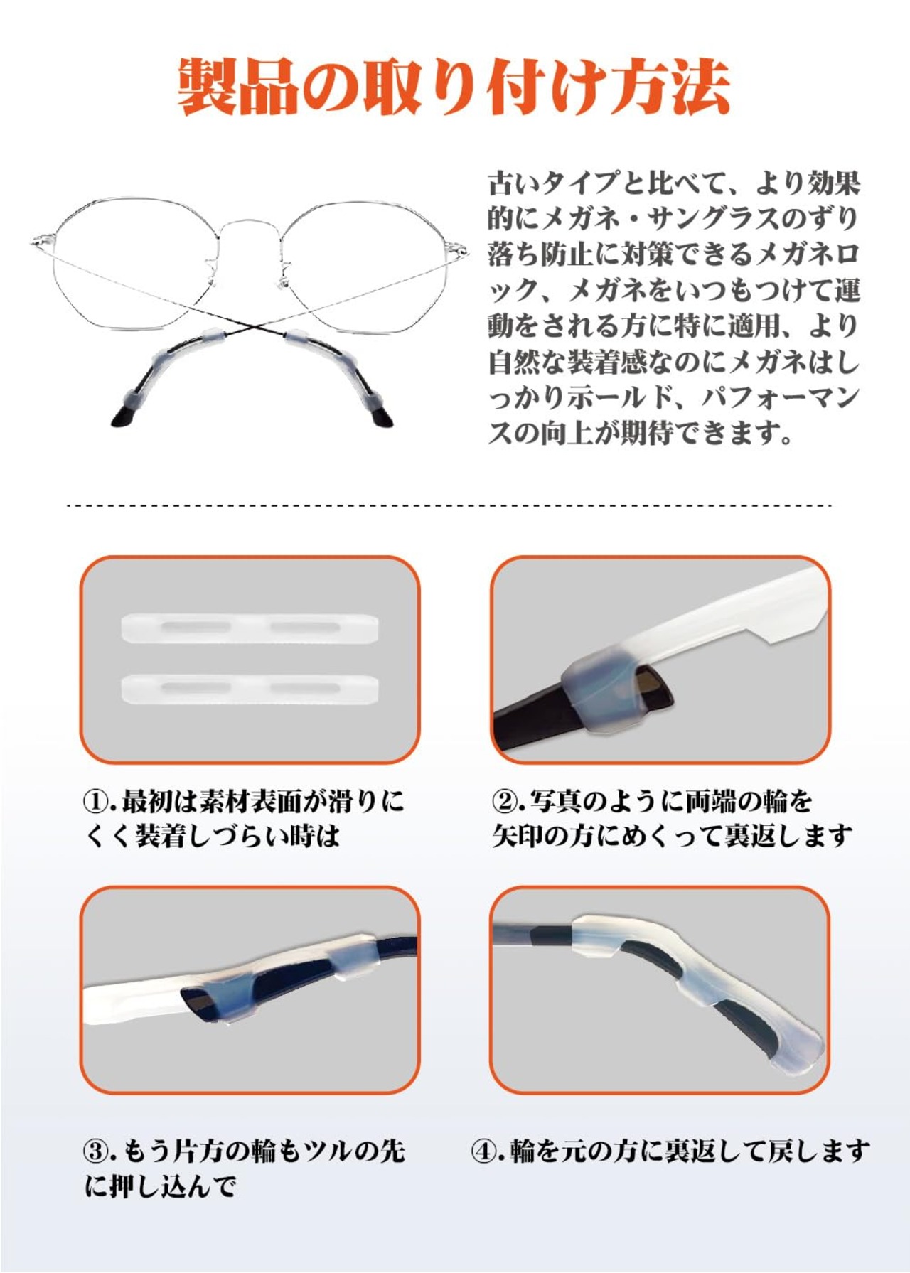 【製品仕様】4セット(8枚)従来のストラップのタイプと違い 「後頭部の締め付けがきつい」 「髪の毛が引っかかる」 「メガネが鼻に食い込んで圧迫感を感じる」 などの不快感から解放されます。伸縮性が良い素材を使用しているので、3mm~10mmのフレーム、テンプル、ツルに適用します。