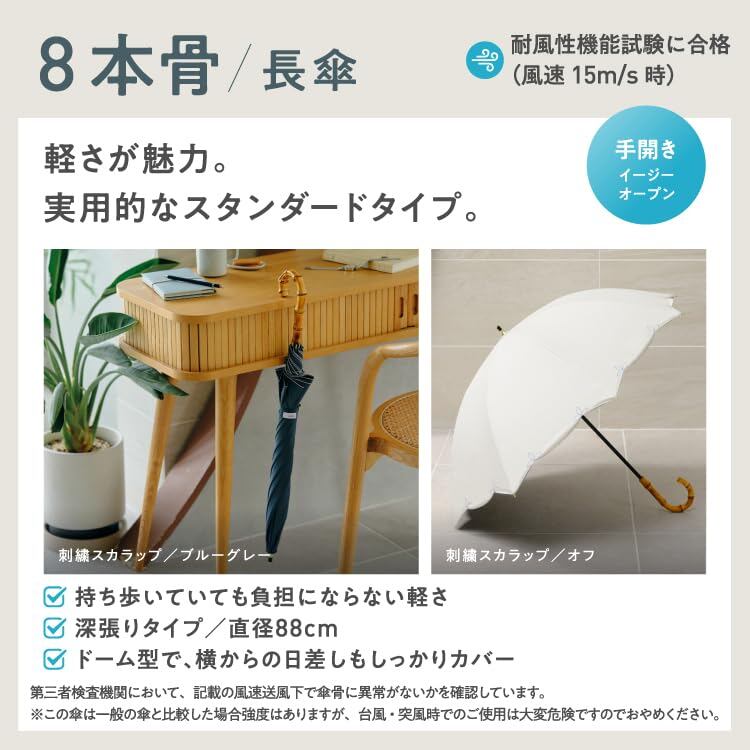 【使い勝手の良いスタンダードな8本骨】 深張りの上品な丸みを帯びた、ドーム型シルエットの長傘。 定番の8本骨ながらも親骨55cmと少し大きめサイズなので、しっかりと日差しをカバーしてくれます。 また親骨にグラスファイバー素材を採用することで、軽量化と丈夫さを強化。 耐風性能試験にも合格しています。