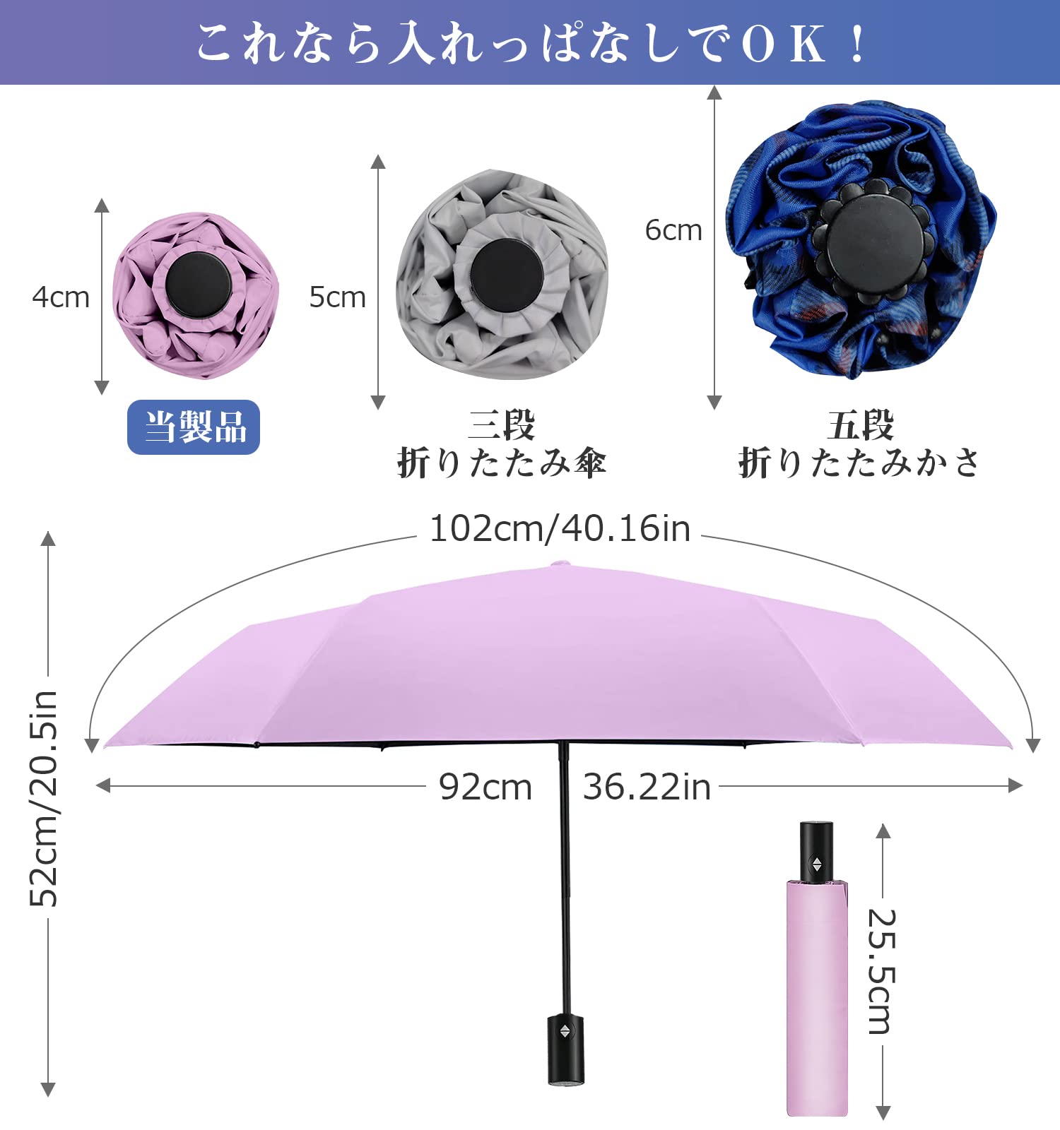 【ワンタッチ自動開閉式傘】 片手で簡単に開閉できる自動開閉式の折り畳み日傘です。車の乗り降りや荷物が多い時にも便利な女性用日傘です。強い日差しには傘を開いてボタンを押すだけで、紫外線から守ります。通勤や通学はもちろん、夏フェス、イベント、キャンプ、アウトドア、旅行など、紫外線を気にせずに夏を楽しむことができます。使い勝手と紫外線対策に優れた、女性にぴったりの折りたたみ傘です。(ご注意:この傘は軽いデザインなので、ボタンが小さく、ボタンの中を押しても開閉できます。)