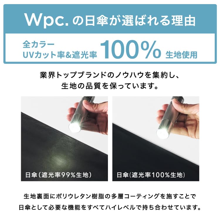 【遮光率・UVカット率100%、UPF50+】 全カラー遮光率・UVカット率ともに100%、UPF50+を実現し、日差しからお肌を守ります。 日焼けを防ぐために必要なUVカットの性能を兼ね揃えた、紫外線対策にはピッタリの日傘です。 涼しく過ごすための遮熱性も優れているため、暑い夏の熱中症対策にも。