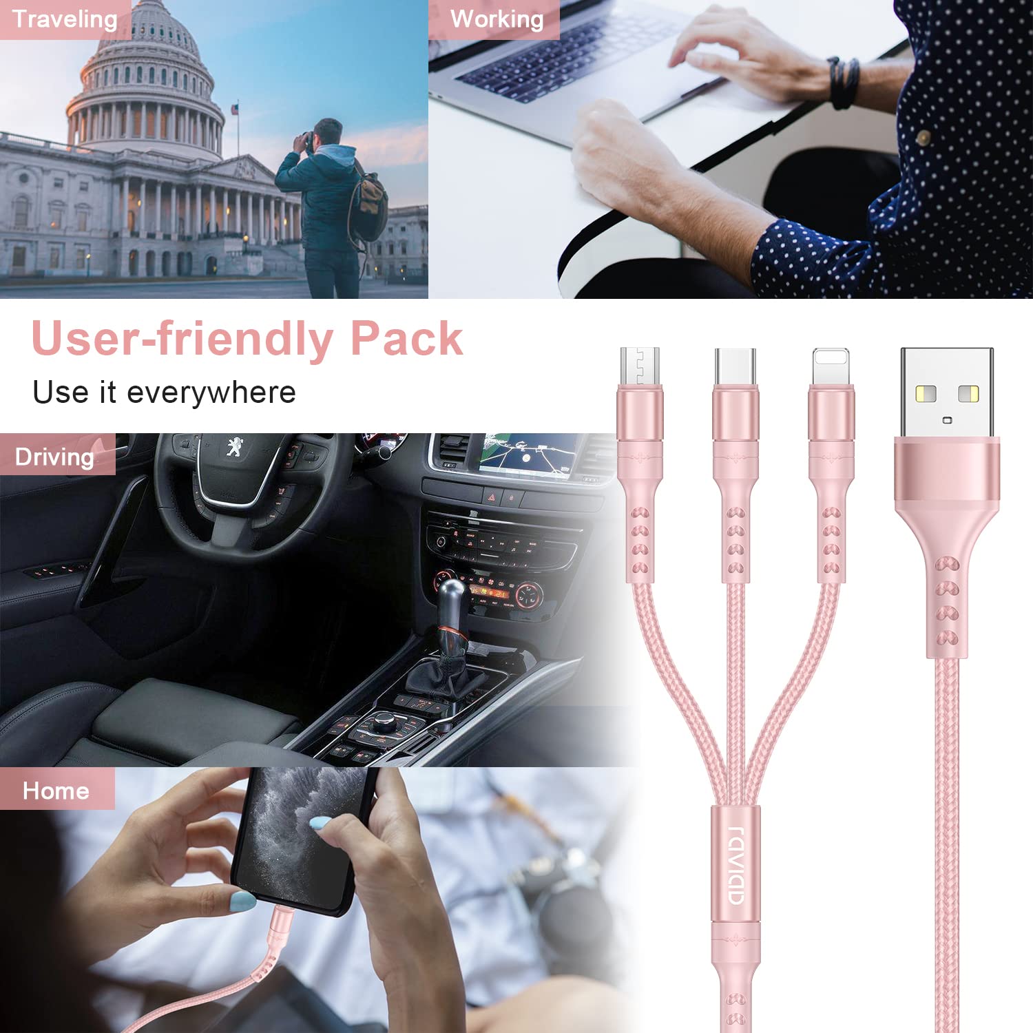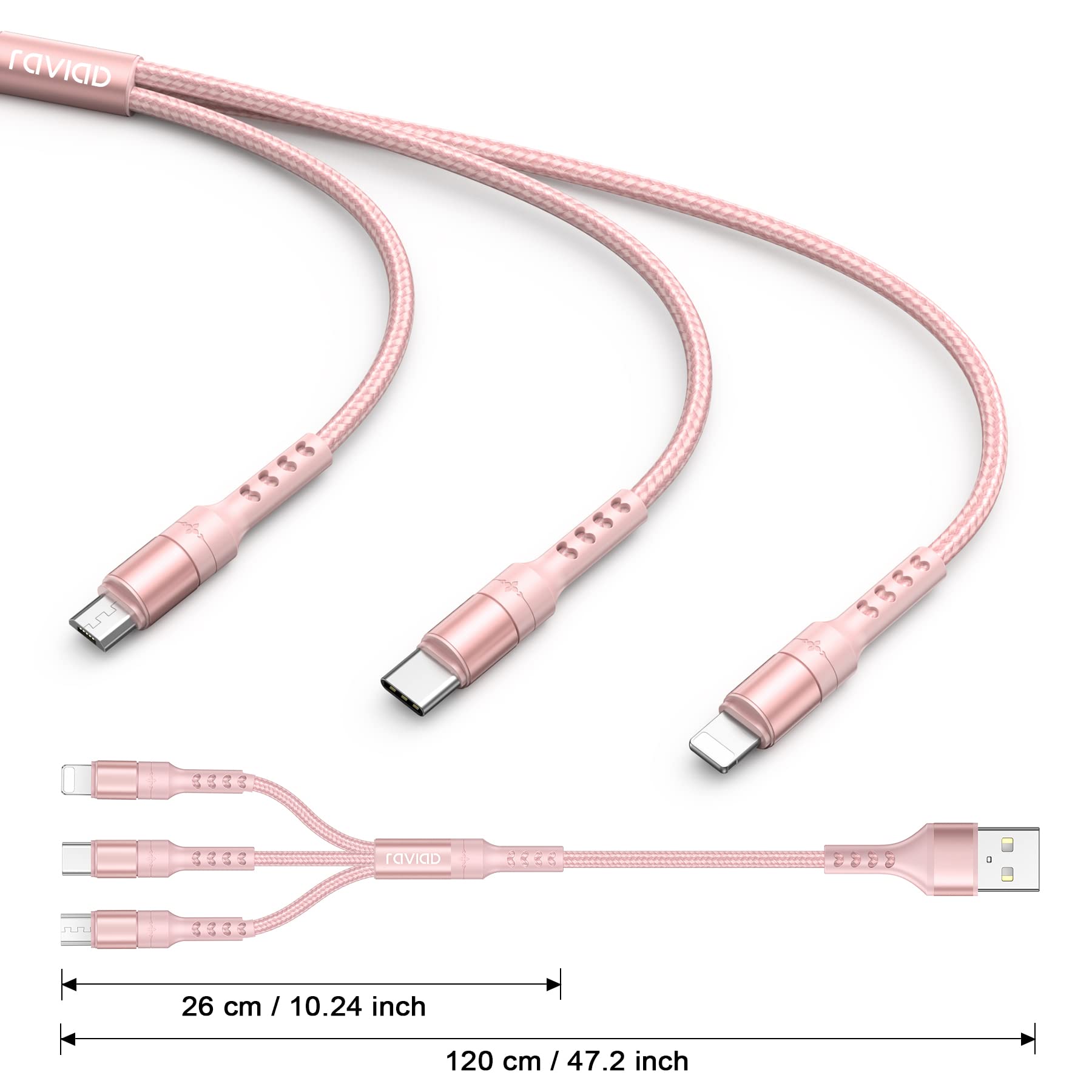 RAVIAD 3in1 充電ケーブル USB ケーブル 3A 急速充電 充電コード USB Type C ケーブル Micro USB ケーブル Phone 充電ケーブル 3台同時給電可能 Phone Android タイプC Galaxy Kindle 等全機種対応 超高耐久 - 1.2M ピンク