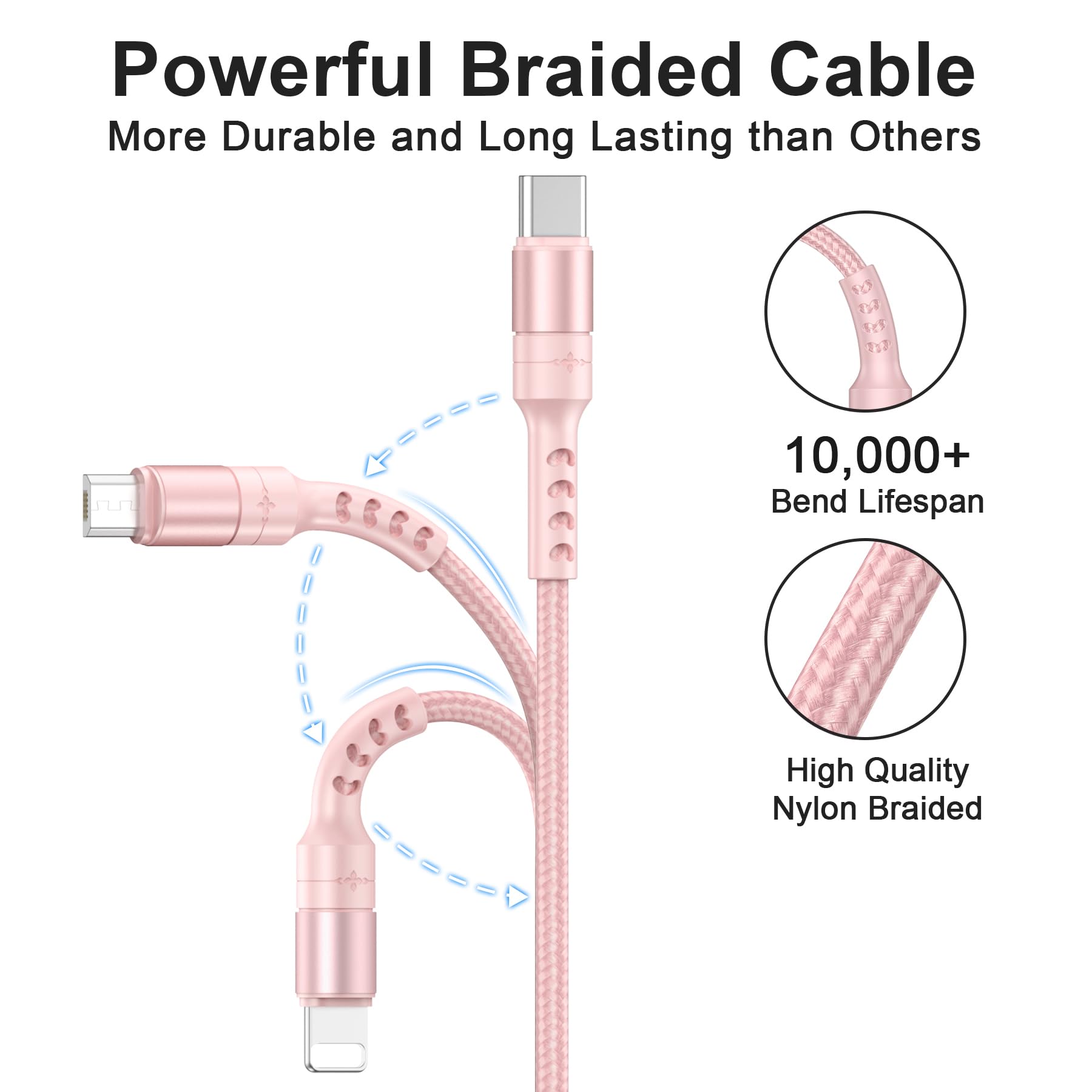 【高い耐久性】充電コード 3in1 耐久性が抜群なアルミニウム合金とナイロン編みのでを使用し、柔軟性が良く。取り回しやすく、絡まりを防ぎ、柔らかくて断線しにくい。一般的なケーブルより5倍以上長持ちします。