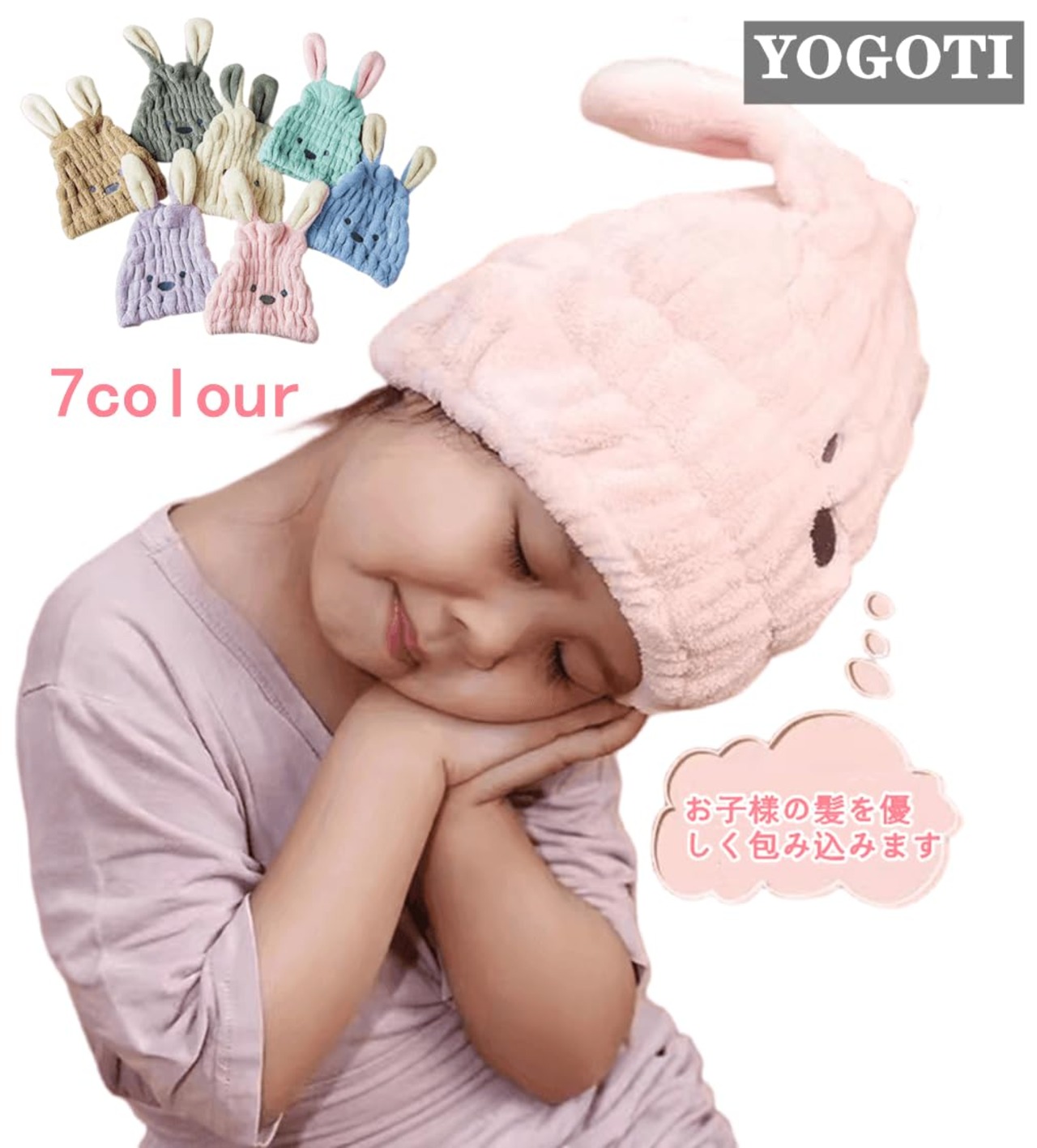 【在庫セール】YOGOTI タオルキャップ ドライキャップ ヘアドライタオル ヘアキャップ タオル 帽子 キッズ 子供 可愛い うさぎ 強い吸水力 速乾 洗顔 プール お風呂上り 被るだけ 7色 男女兼用 (アイボリー) | ニコニコSHOP
