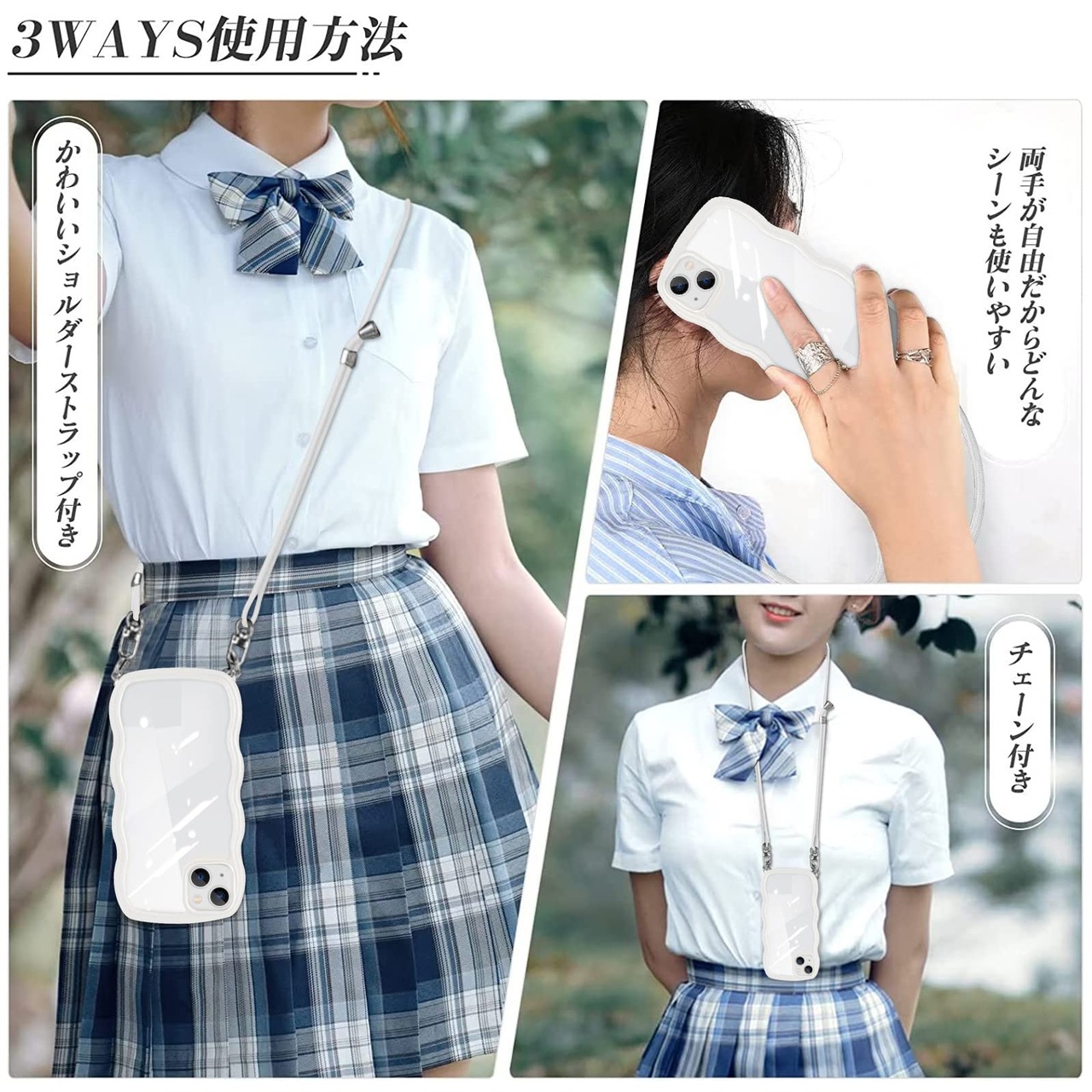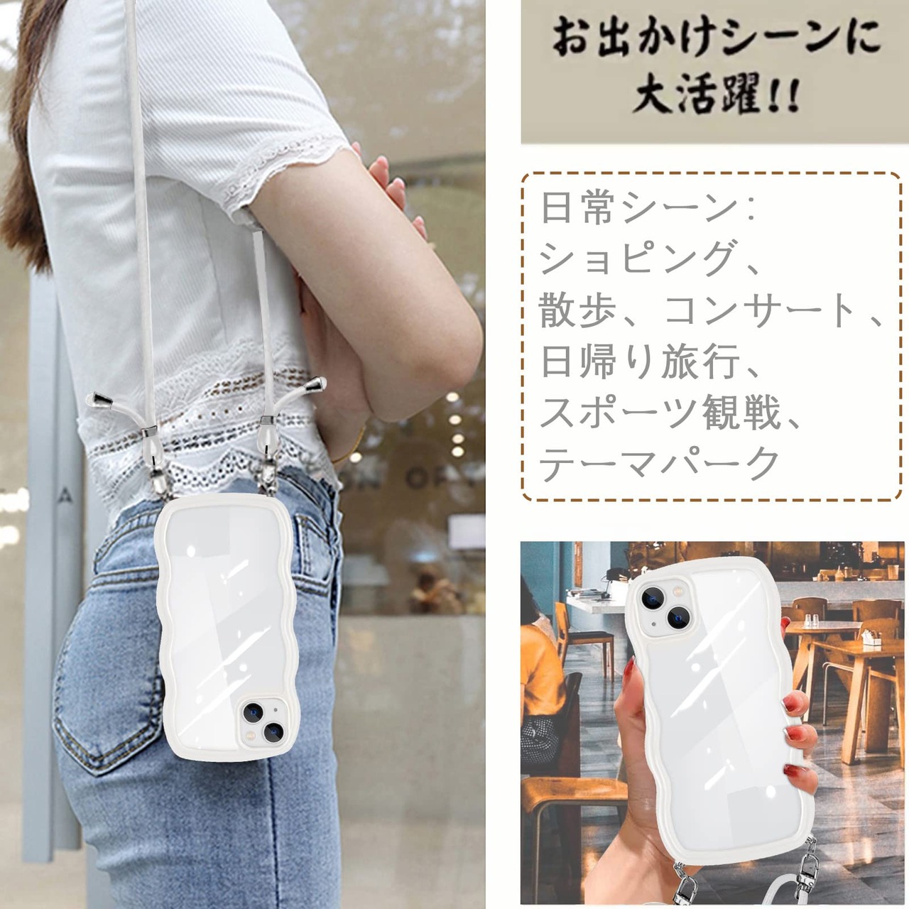 iPhone15 用 ケース ショルダー クリア いphone15 スマホケース カバー アイフォン15 透明 TPU ストラップ付き 肩掛け 首掛け 紐付き 斜めがけ 創意 個性 可愛い かわいい 韓国 薄型 耐衝撃(ホワイト)