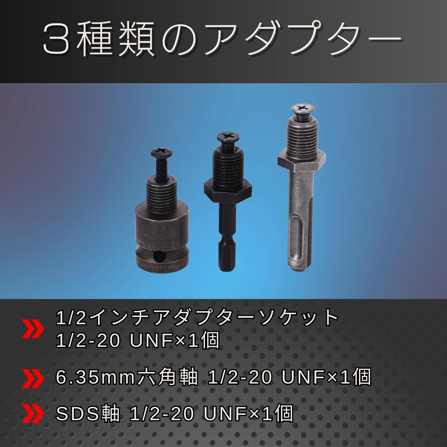 このセットは、キーハンドル付きドリルチャック、キーレスドリルチャック、ソケットアダプタを含んでいます。