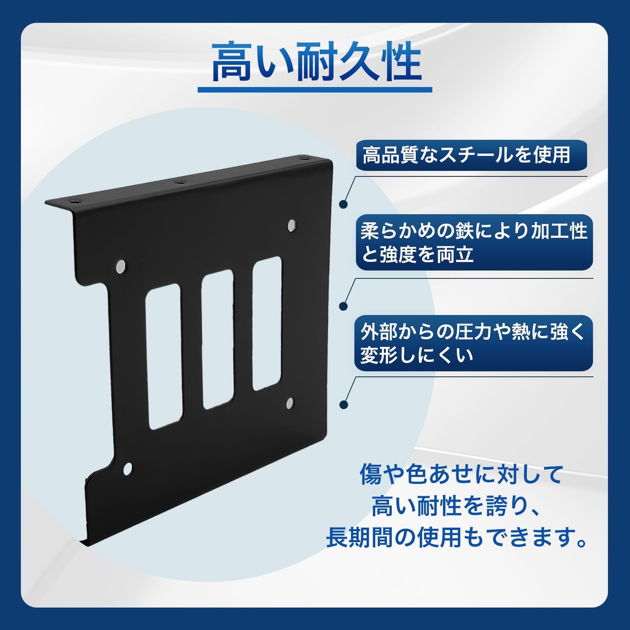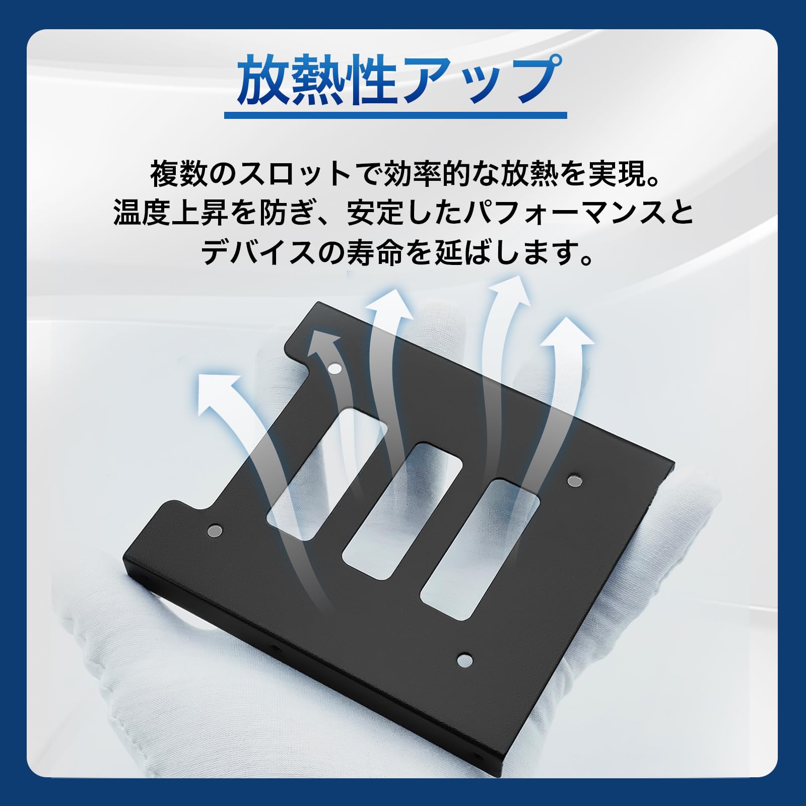 【効率的な放熱を実現するスケルトンスロット設計】この変換マウントは、複数のスロットを設けることで、2.5インチHDD・SSDが空気と接触する面積を大幅に増加させています。この巧妙な設計により、ドライブ内部の熱を迅速かつ効果的に外部へ放出・放散することが可能です。スケルトンデザインの特徴は、優れた放熱性を提供するだけでなく、ドライブの温度上昇を防ぎ、安定したパフォーマンスを維持することにも寄与します。高温によるハードドライブの劣化や故障を未然に防ぐことで、データの安全性を確保し、デバイスの寿命を延ばし保護できます。このマウントの放熱性能は、特に高負荷の作業環境や長時間の使用において、その真価を発揮します。