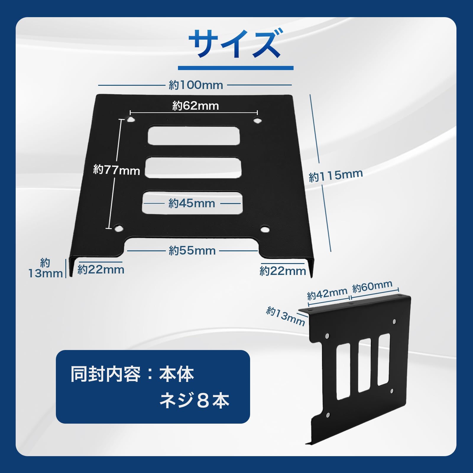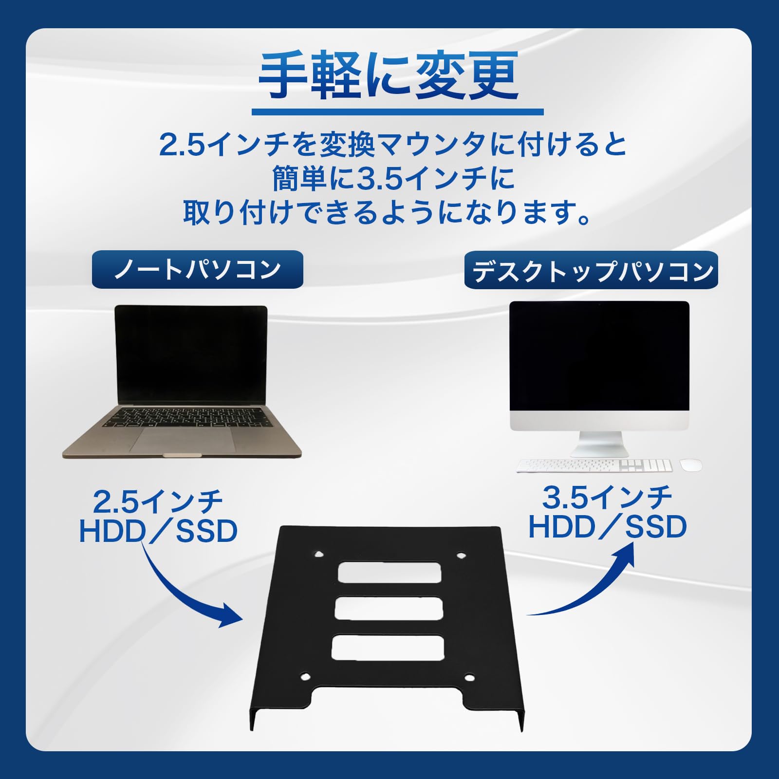 【2.5 3.5 変換 マウンタ】この黒のHDD・SSDのケース、金属製ブラケットは、2.5インチのハードディスクドライブやソリッドステートドライブをデスクトップのパソコン筐体の3.5インチマウントブラケットに、自作で簡単に取り付けることができます。2.5インチベイから3.5インチベイへの交換に適応力抜群の変換マウンタです。2.5インチのノートPCハードディスクを完全に支配し、デスクトップPCの3.5インチドライブ位置に手軽に装着可能です。また他のデバイスで3.5インチドライブを保持する場合でも、その力を余すことなく発揮します。この2.5インチPC用のHDDケース・SSDケース・ブラケットがあれば、どんなデバイスでも完璧な適応を遂げることでしょう。
