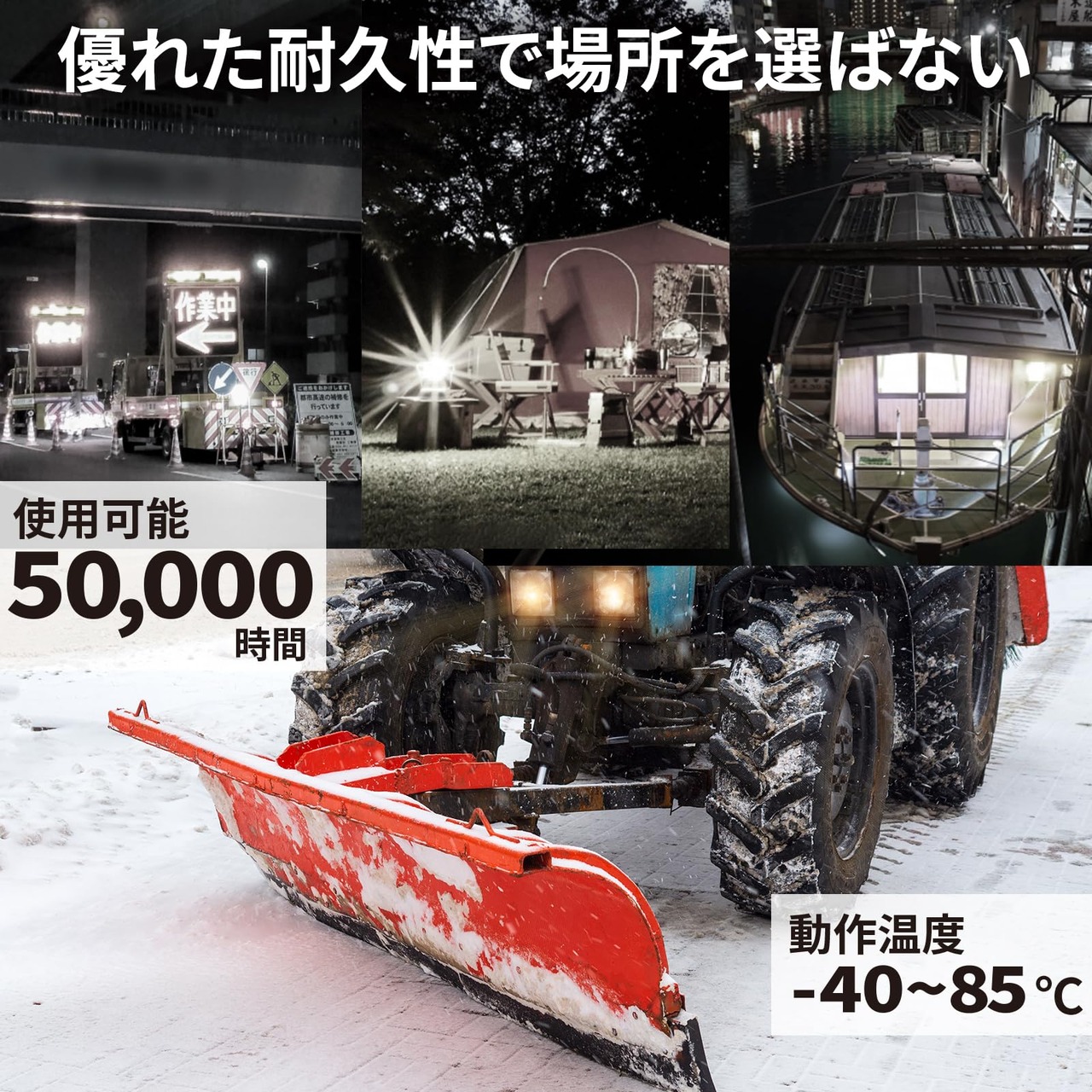 【優れた耐久性。車用だけでなく場面も選ばずデイライトとして使用可】車での活用だけでなく無数の場所で使えます。屋外照明、路肩灯、トラック荷台のLED照明、キャンプライト、アウトドアライト、夜釣りのライト、交通整理、工事現場、災害時などアイデア次第で大活躍します。また使用時間50,000時間の長寿命なので、多彩な場面、過酷な環境でも長期間の使用ができます。