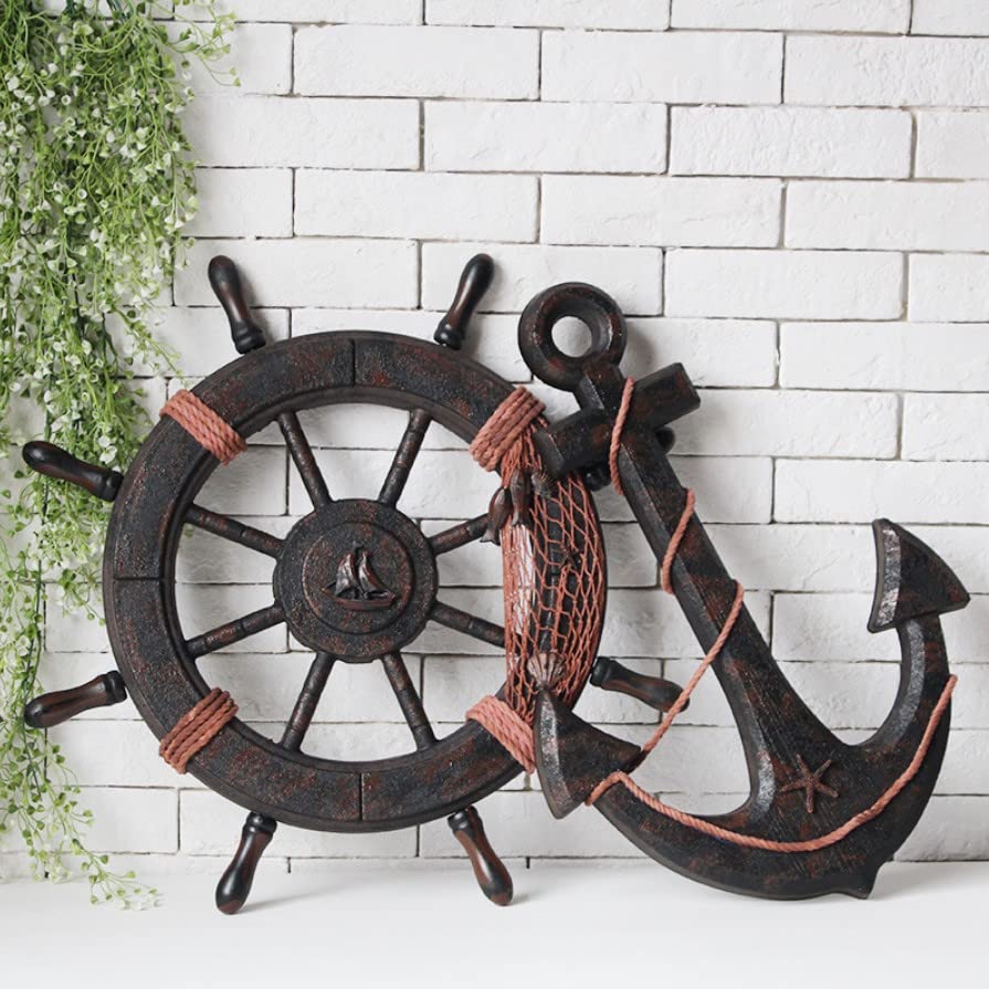 【新着商品】木製 舵輪 錨 アンティーク 海賊 インテリア 御洒落 船 オブジェ レトロ 舟 樽 ガーデニング ガーデニング雑貨 店舗用看板 ハワイ ビンテージ アパレル (M 錨 舵輪 セット) | ニコニコSHOP